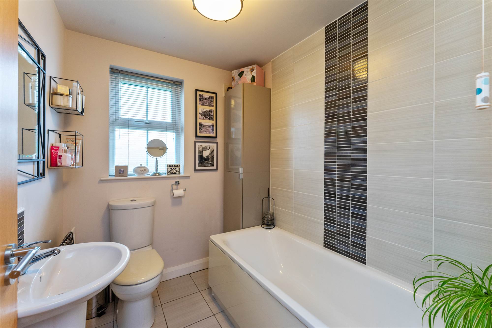 Tiled floor and partly tiled walls, panelled bath with mixer taps, low flush WC, pedestal wash hand basin with mixer taps.