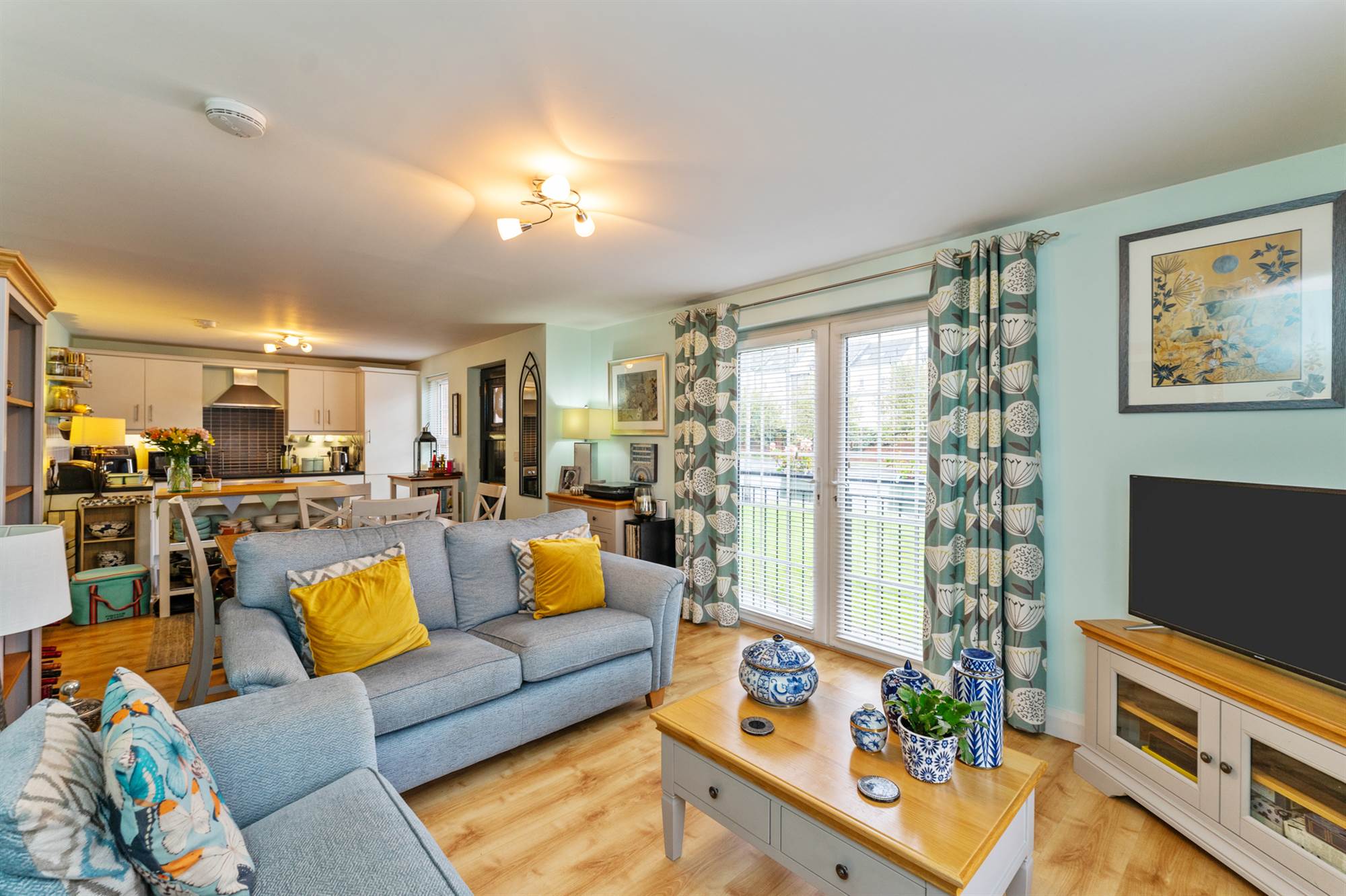 Spacious open plan kitchen, living, dining area with sliding French doors to Juliet balcony