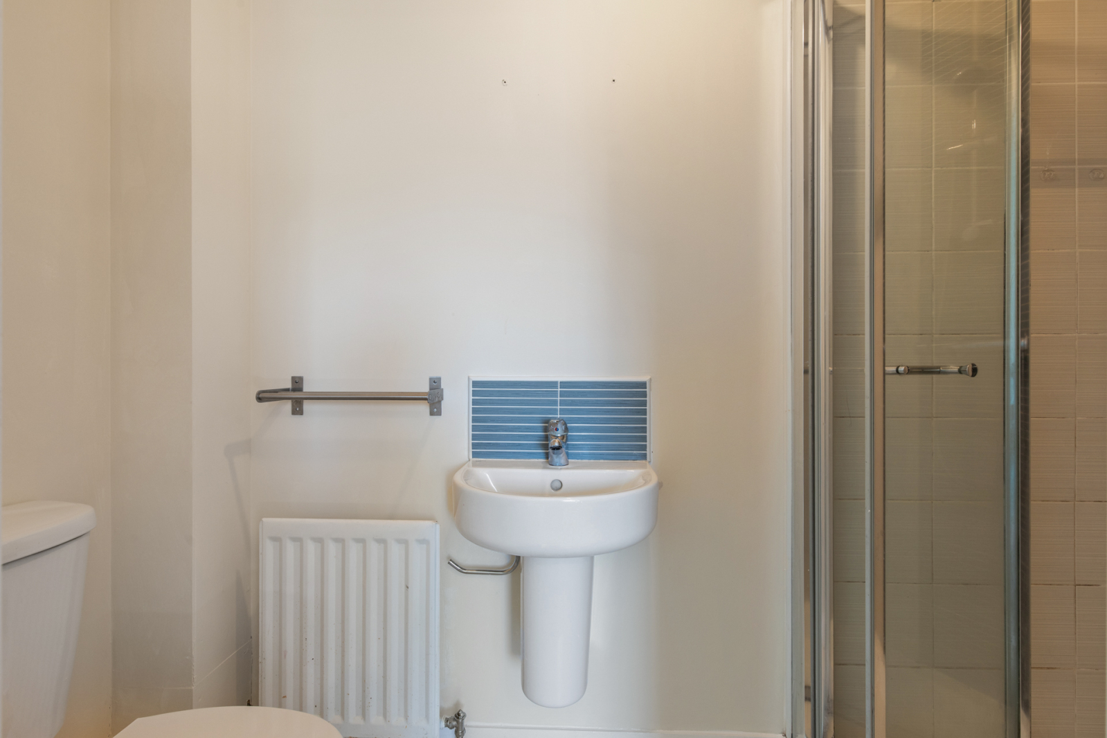 Comprising: Panelled bath with mixer taps , overhead shower with glass shower screen, low flush WC, wash hand basin with mixer taps and tiled splashback, extractor fan, tiled floor.