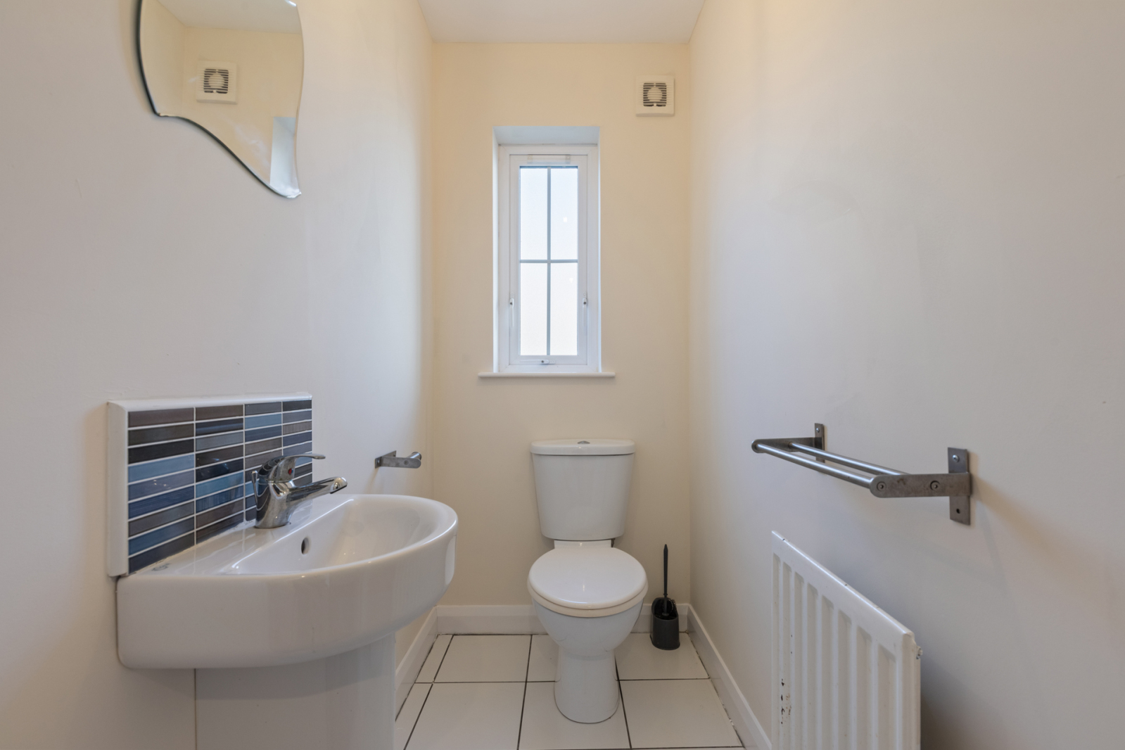 Low flush WC, wash hand basin with mixer taps and tiled splashback, extractor fan, tiled floor.