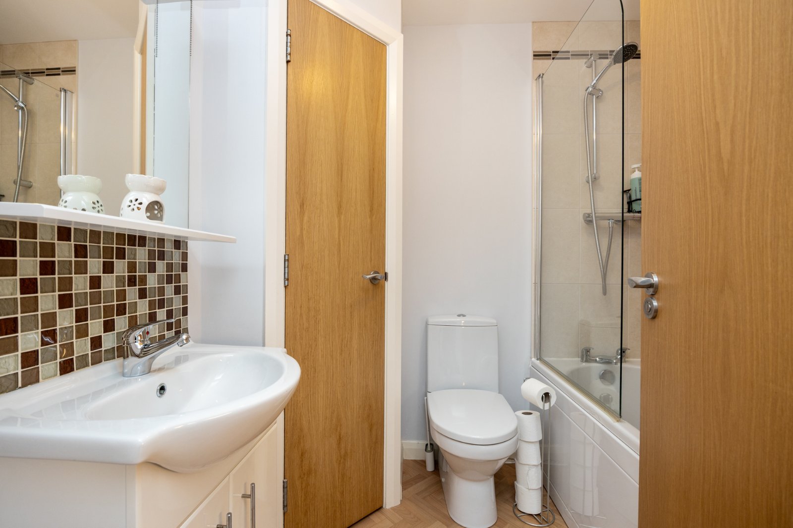 Contemporary white suite comprising: Low flush WC, wash hand basin with chrome mixer taps and tiled splashback in vanity unit, panelled bath with chrome mixer taps and chrome thermostatically controlled shower over, glass shower screen, extractor fan.