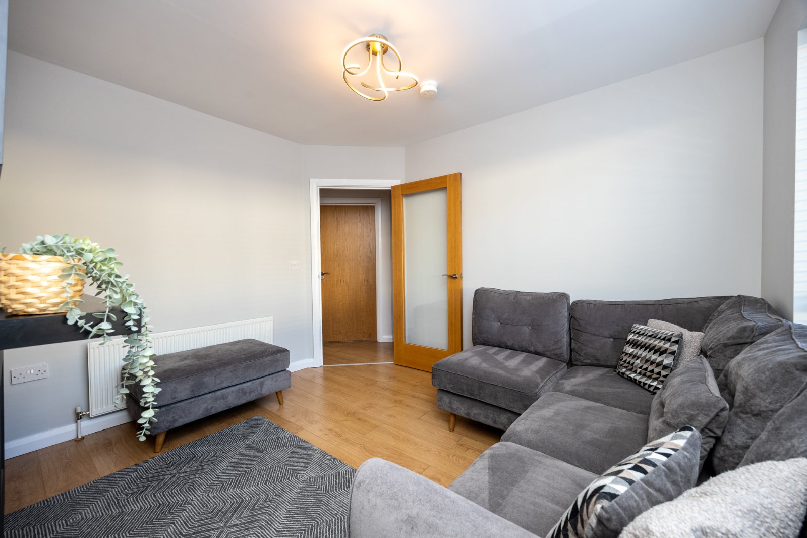 Laminate wood flooring, low voltage spotlighting, under stairs storage cupboard.