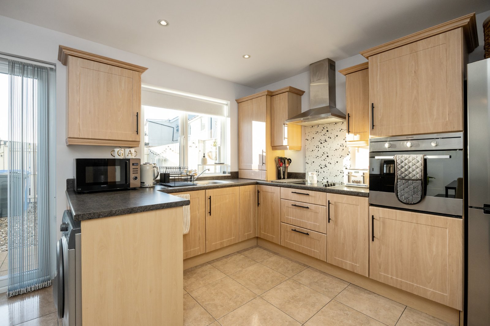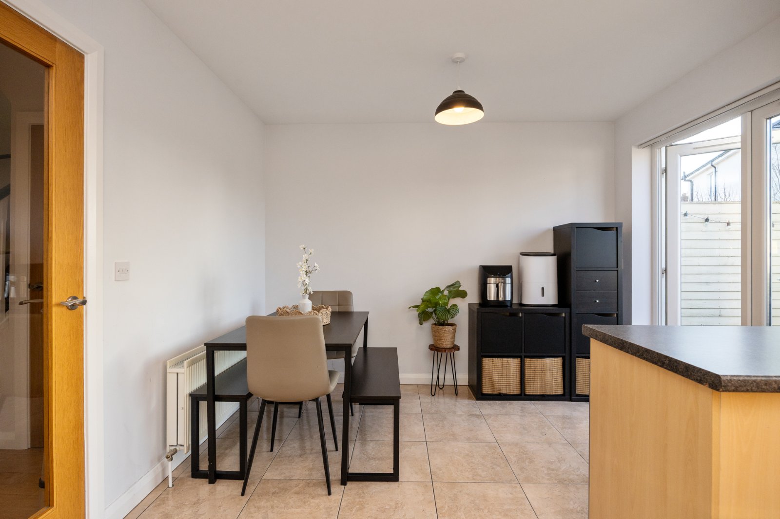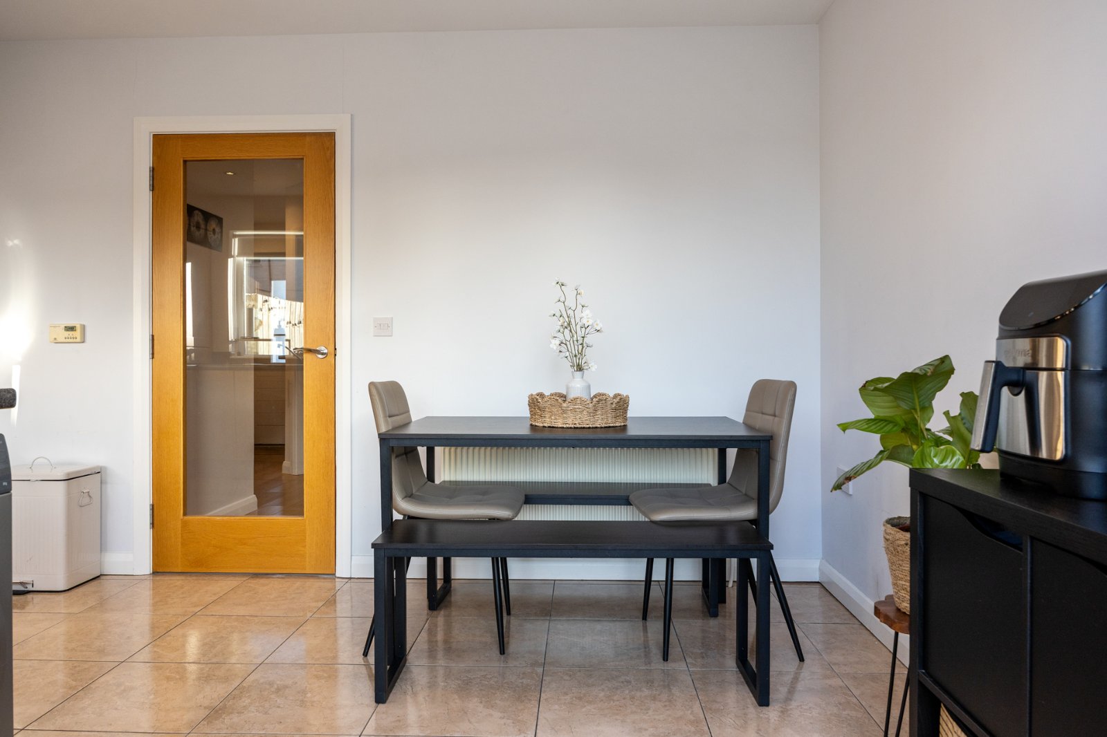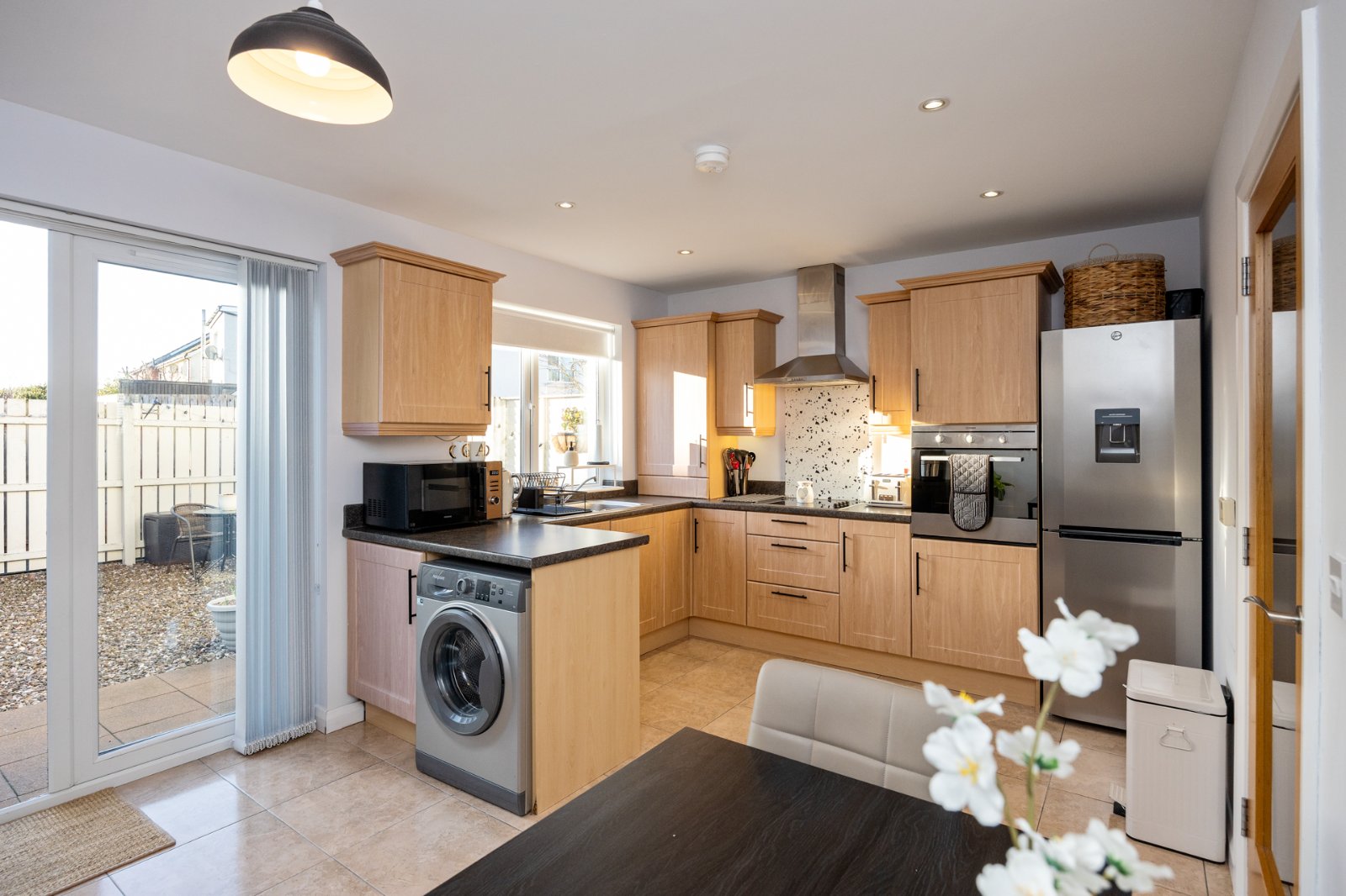 Range of high and low level shaker style units, granite effect work surfaces, single drainer stainless steel sink unit with chrome mixer taps, concealed gas fired boiler (fitted 2 years ago), ceramic hob, stainless steel extractor fan, electric oven, space for washing machine, integrated dishwasher, ceramic tiled floor, uPVC double glazed French doors to low maintenance South facing, fully enclosed rear garden. Space for dining, plumbed for washing machine, low voltage spotlights.