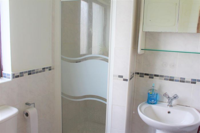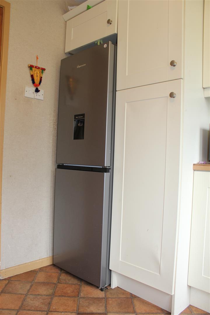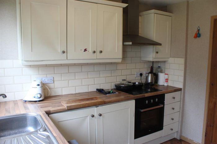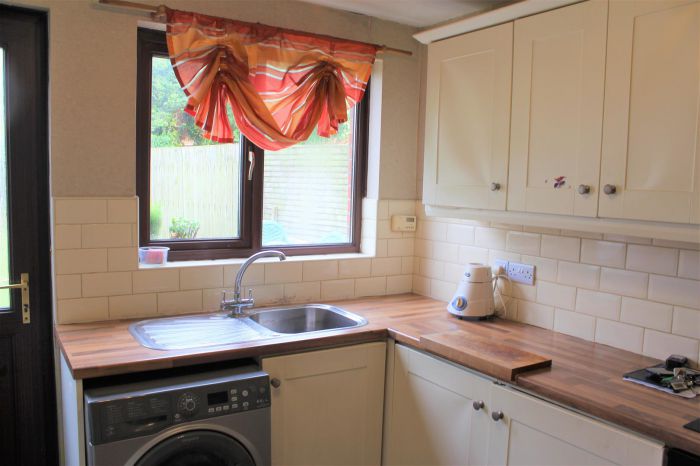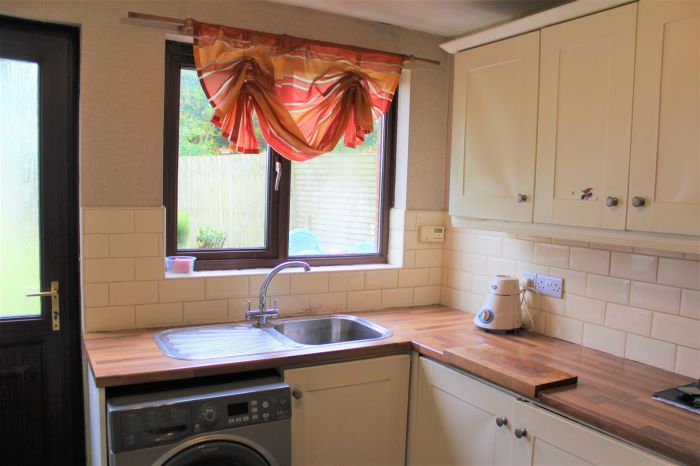 A good size kitchen area with ample storage, space for large fridge freezer, gas hob with oven under, extractor fan, back door with access to rear garden, partially tiled walls.