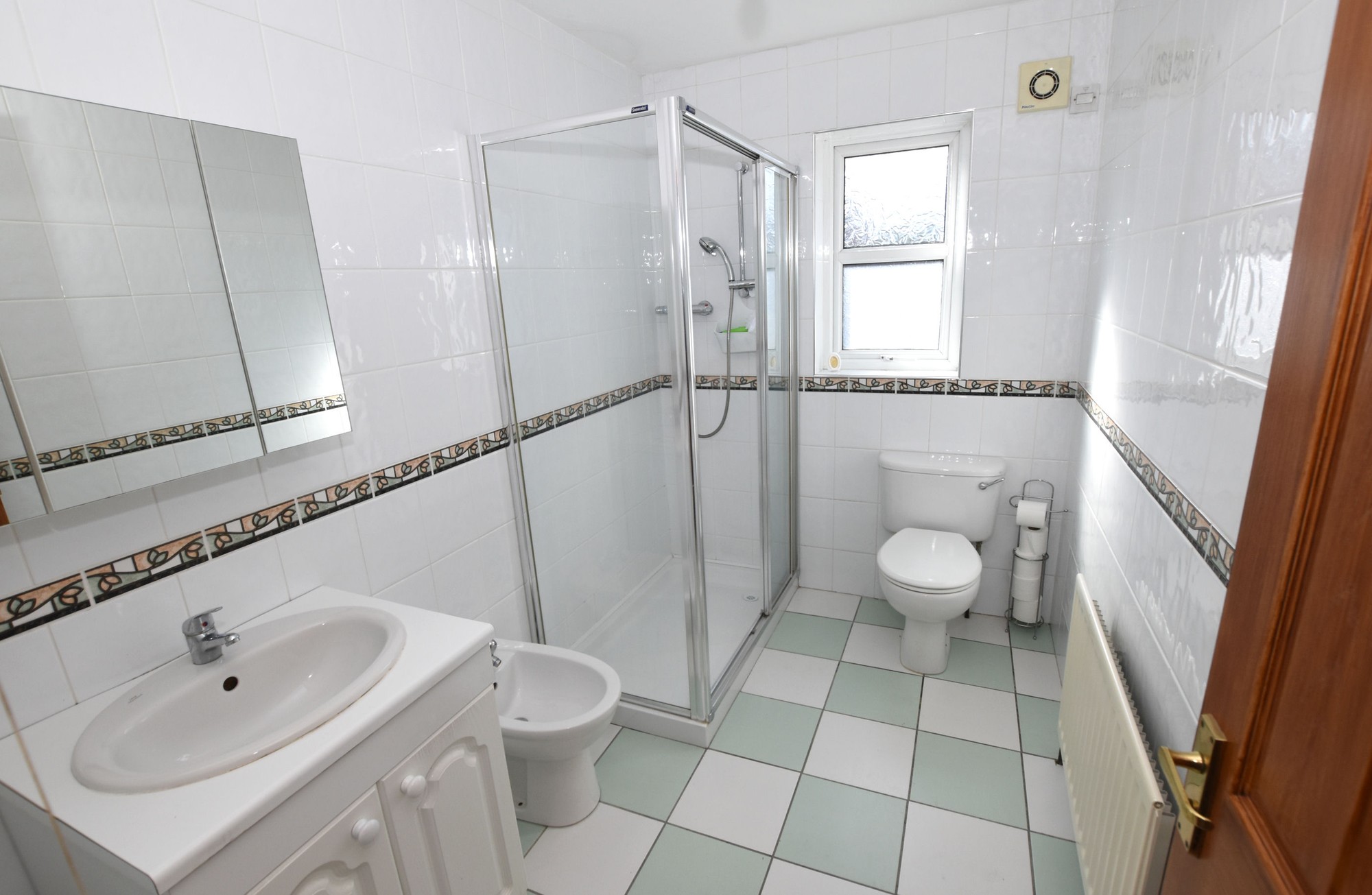 4 piece white suite comprising; low flush WC, pedestal wash hand basin in Vanity unit, bidet, fully tiled corner shower cubicle with Telephone hand shower. Tiled flooring, tiled walls floor to ceiling. Single panel radiator.