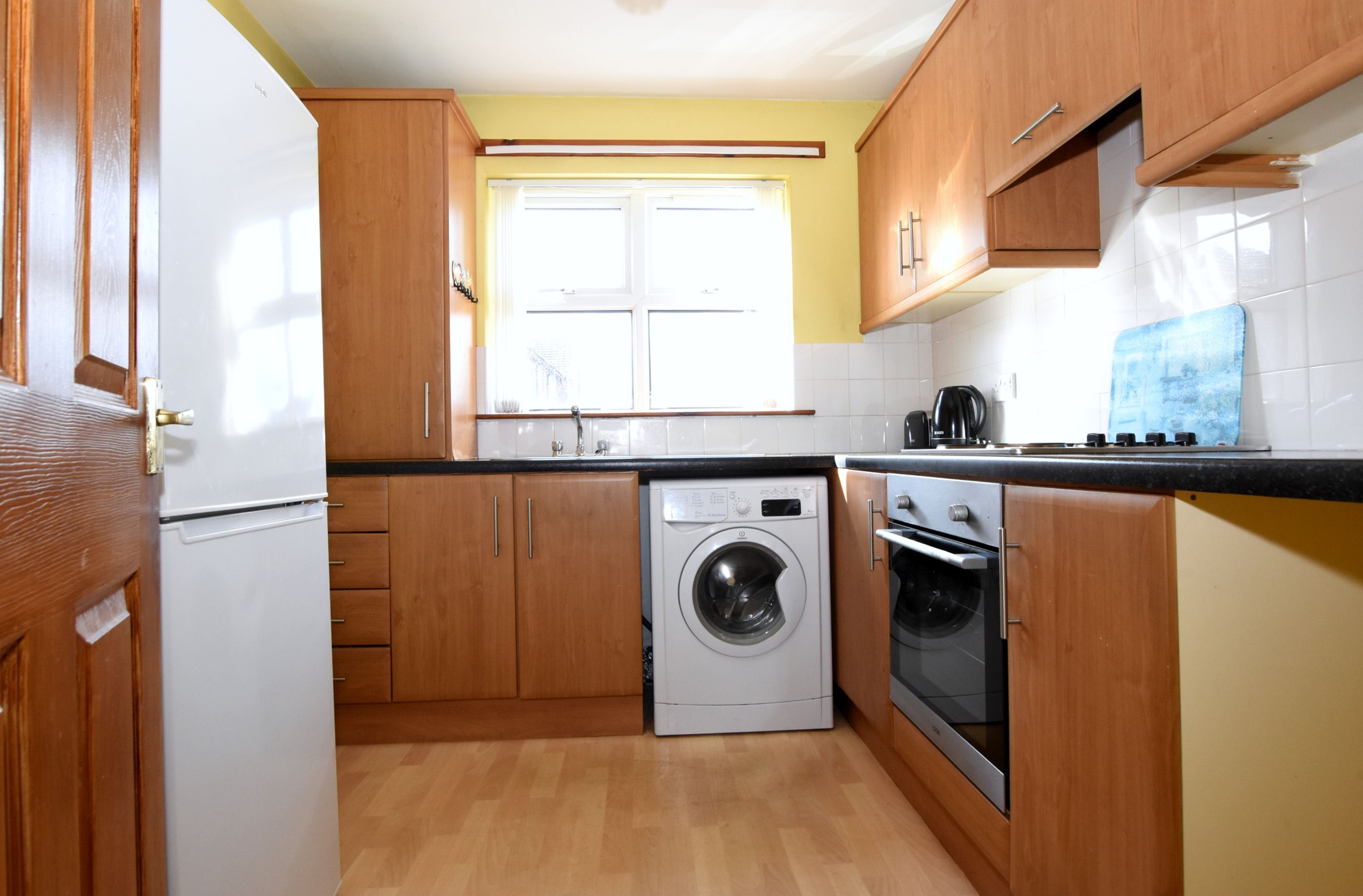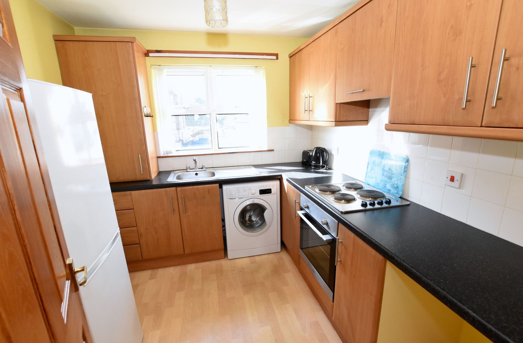 Great range of high and low level Beech effect units with roll edge worktops.1 1/2 tub stainless steel sink unit with mixer taps; plumbed for washing machine. Electric 4 ring hob with low level oven/grill and built in extractor fan over. Feature flooring, part tiled walls. Double panel radiator.