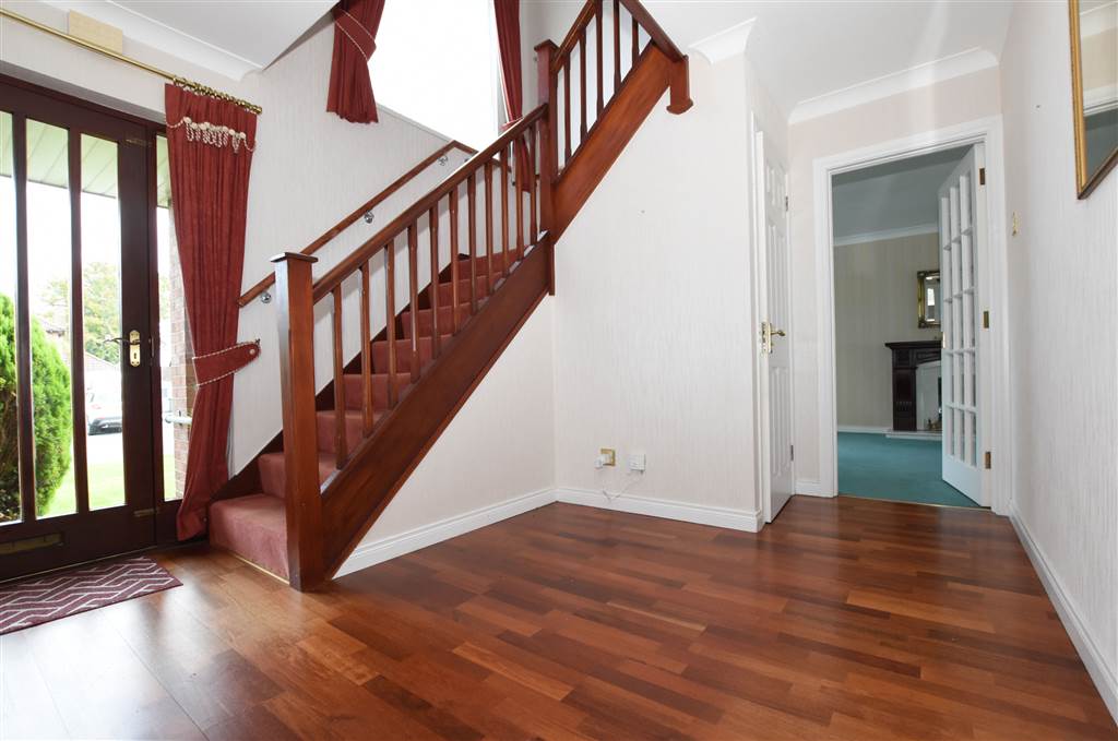 Spacious bright hallway with wooden flooring and downstairs wc.