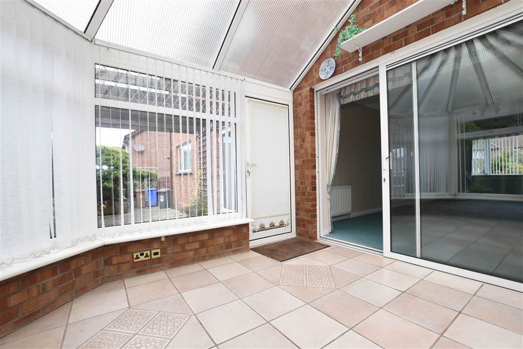 Conservatory with tiled floor, brick base and external upvc door to the garden. There is also a radiator, power socket and sliding doors into the living room.