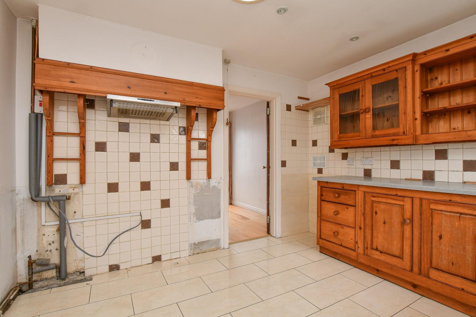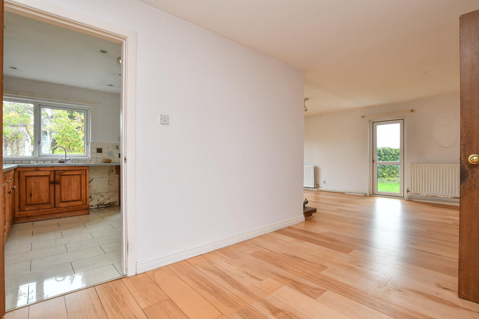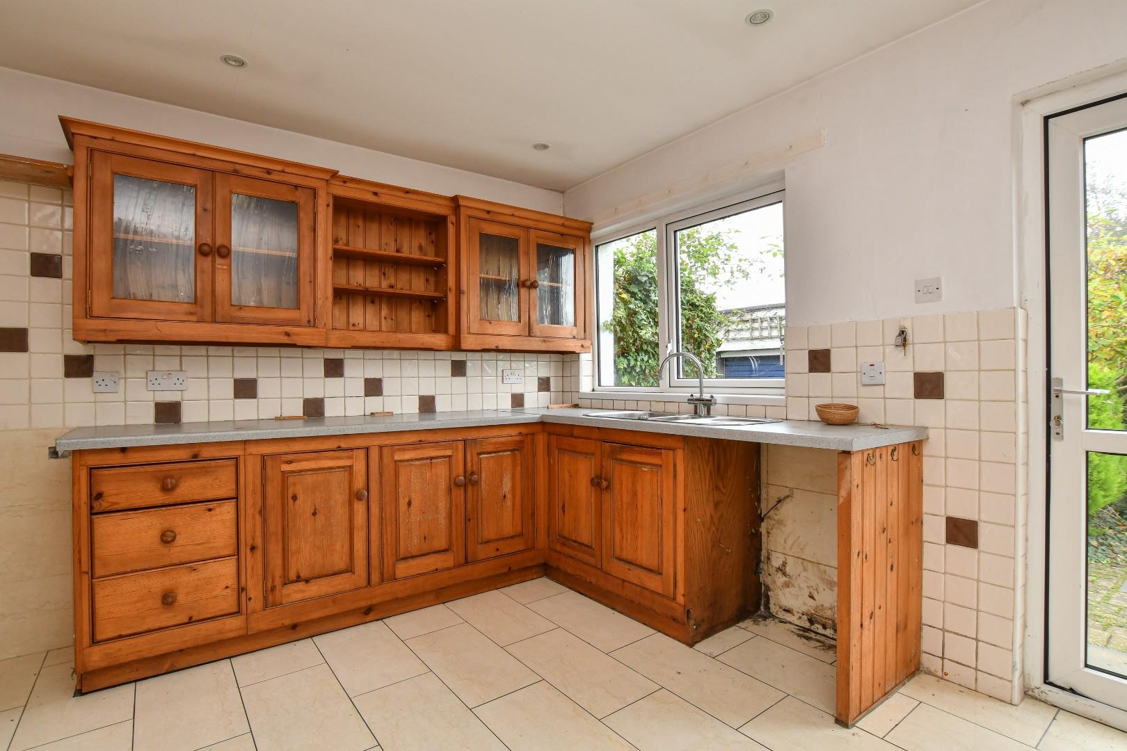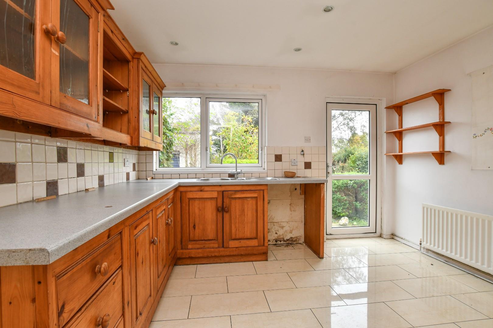 The property features a generous lounge with sliding patio doors leading directly to the private rear garden, creating a bright and welcoming living space. The wooden fitted kitchen is equipped with a range of high and low level units, providing ample storage and workspace.