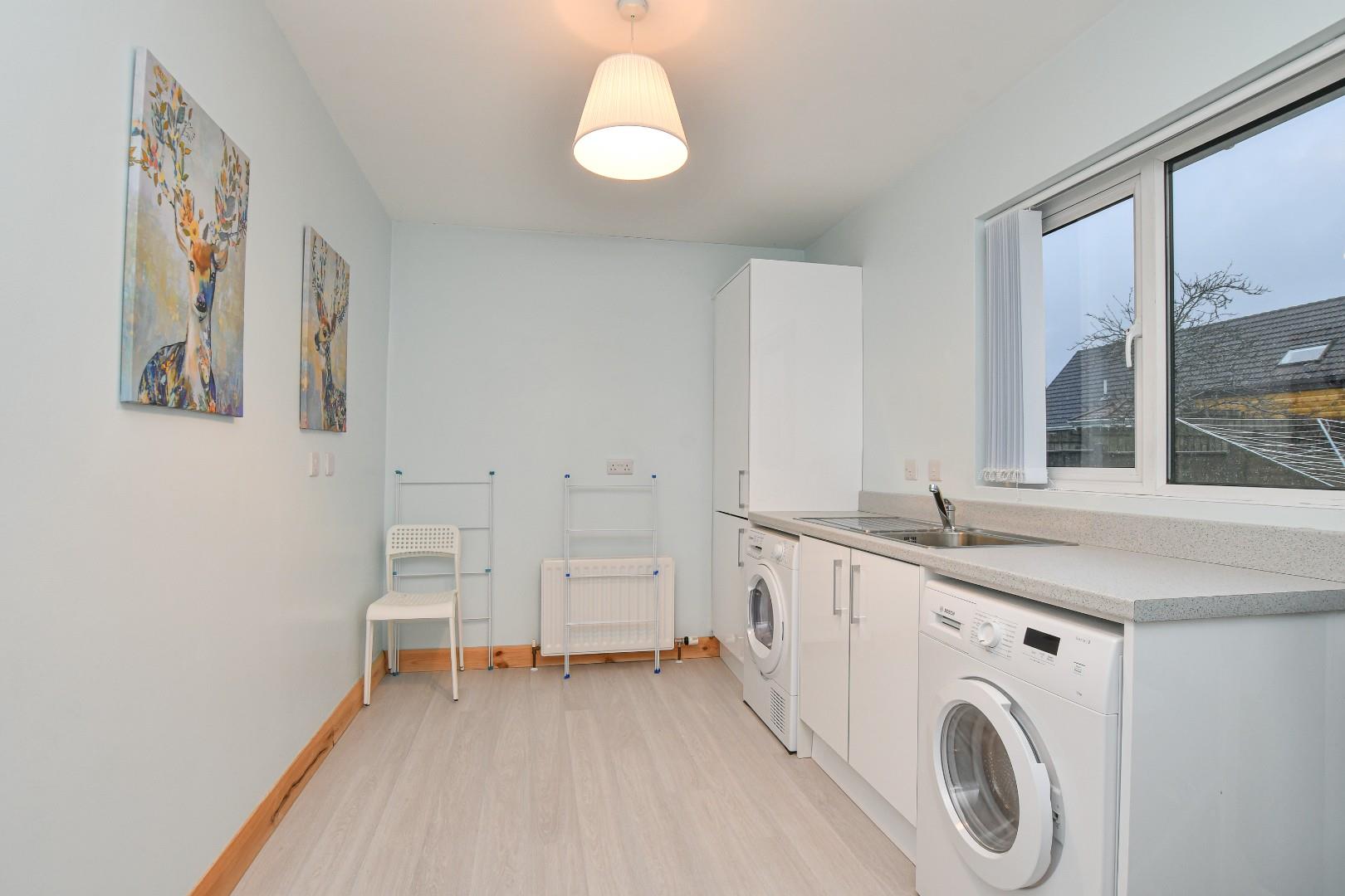 The contemporary white high gloss kitchen is a highlight of the home, offering a modern aesthetic and practical access to a utility room, ensuring that daily chores are a breeze.