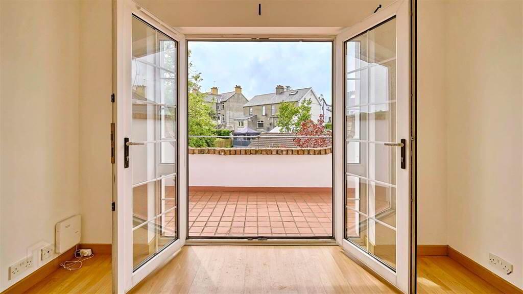 Accessed via a charming communal courtyard, the property boasts a bright and airy living room with double doors opening onto a private terrace-perfect for relaxing or entertaining. The modern fitted kitchen provides ample storage and integrated appliances, while two well-proportioned bedrooms include a master with glimpses of the sea. A contemporary three-piece bathroom suite completes the accommodation, along with a useful floored loft space for additional storage.