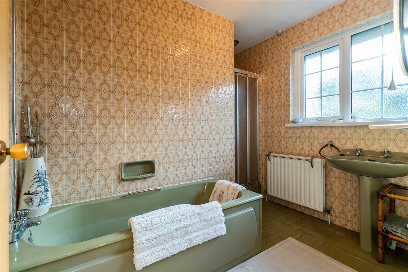 Coloured suite comprising panelled bath with mixer tap and telephone shower, pedestal wash hand basin, low flush wc, fully tiled shower cubicle with thermostatically controlled shower unit, fully tiled walls.