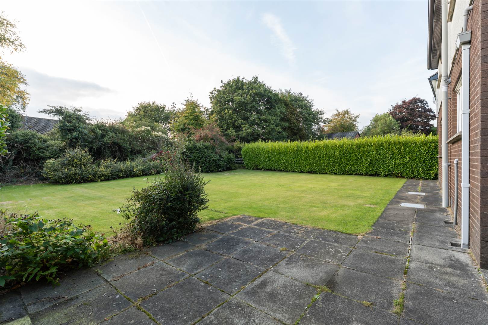 Spacious and private southwest facing garden laid in lawns, flowerbeds and mature shrubs, flagged patio area.