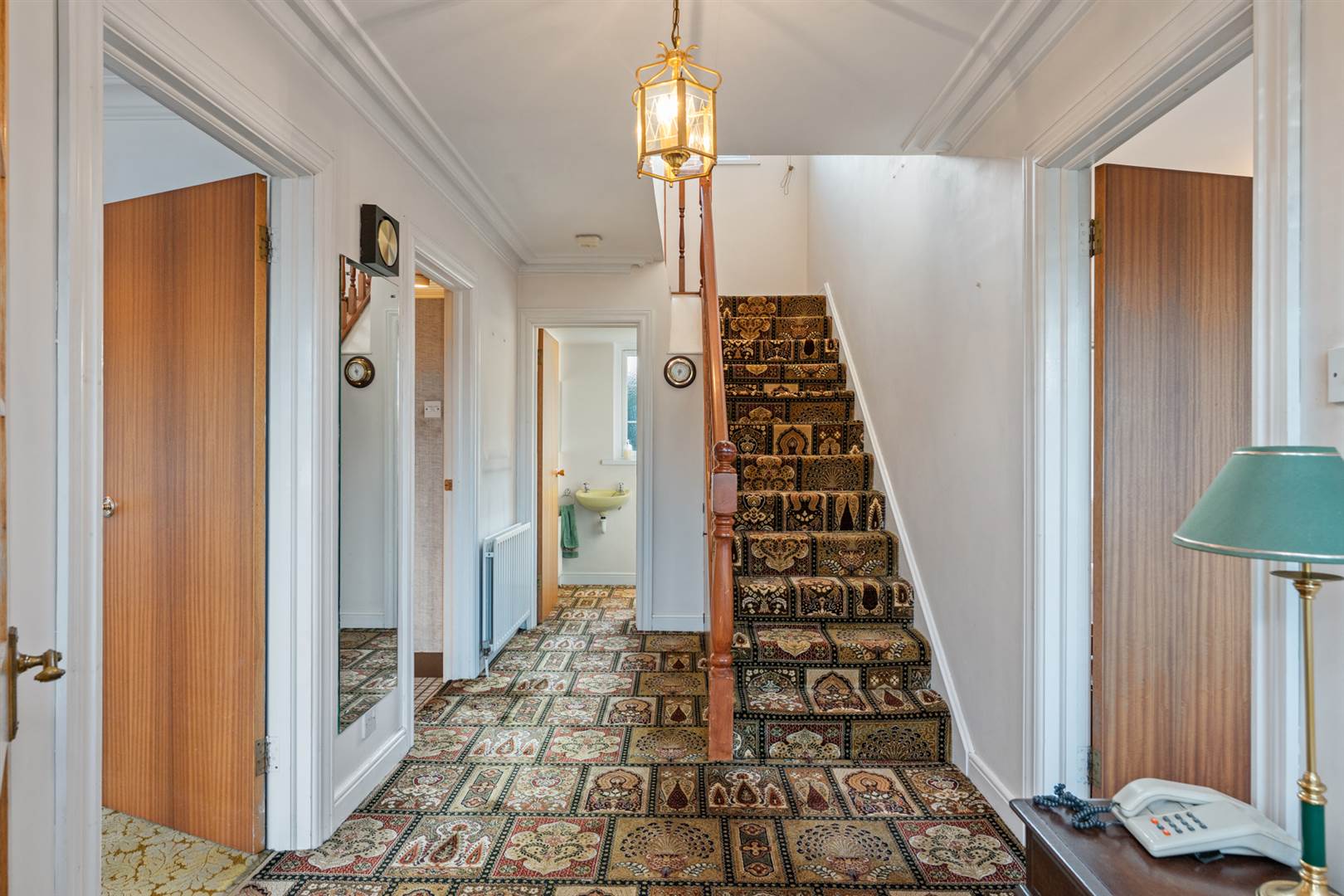 Staircase to first floor with Newel post, handrail and spindles in mahogany, cornice ceiling.