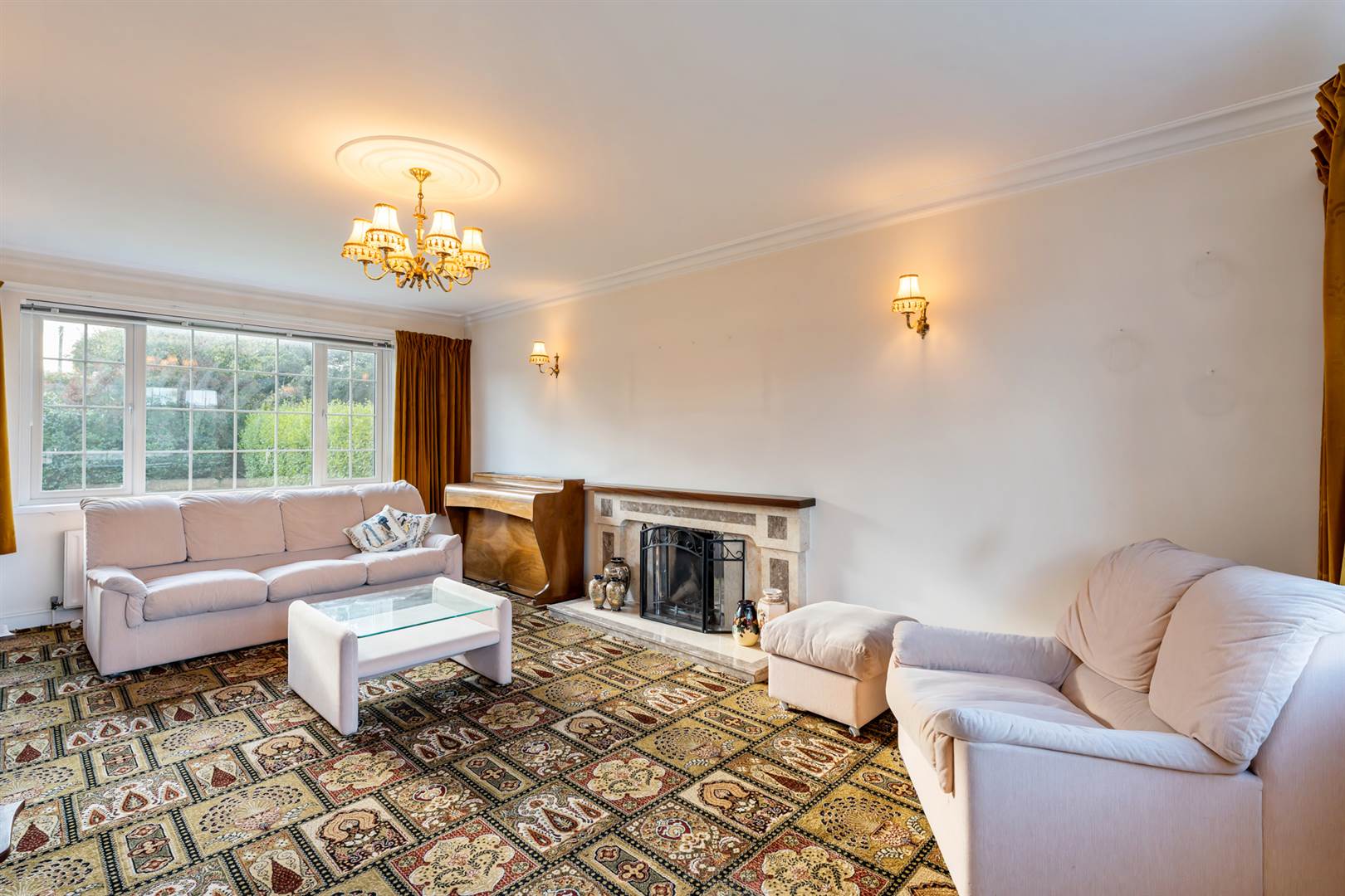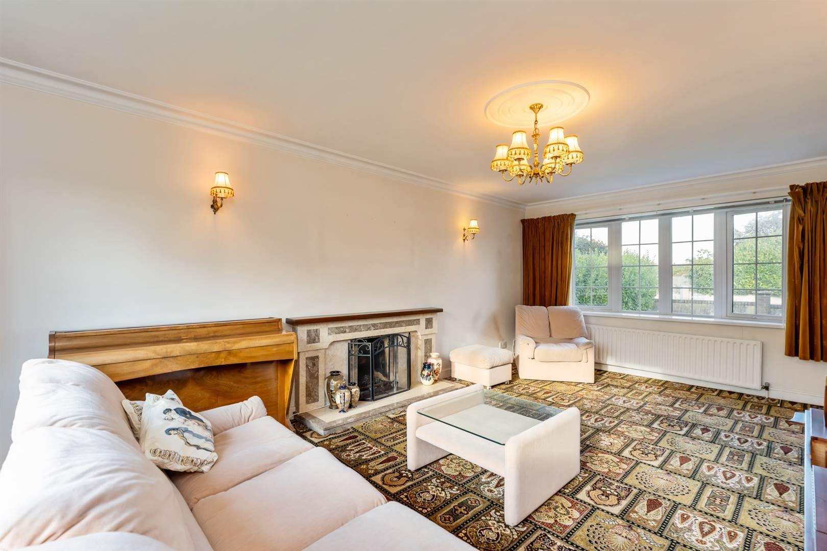 Fireplace with marble inset and hearth, open fire, wall lighting, recessed lighting, ceiling rose, dual aspect.