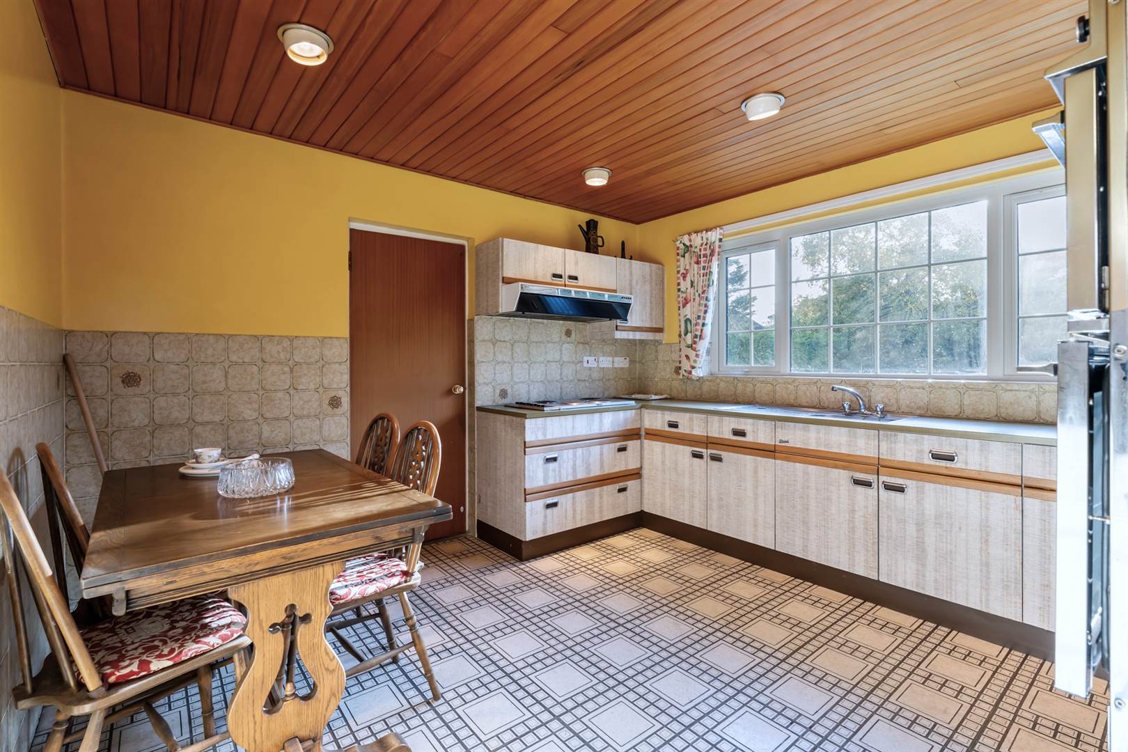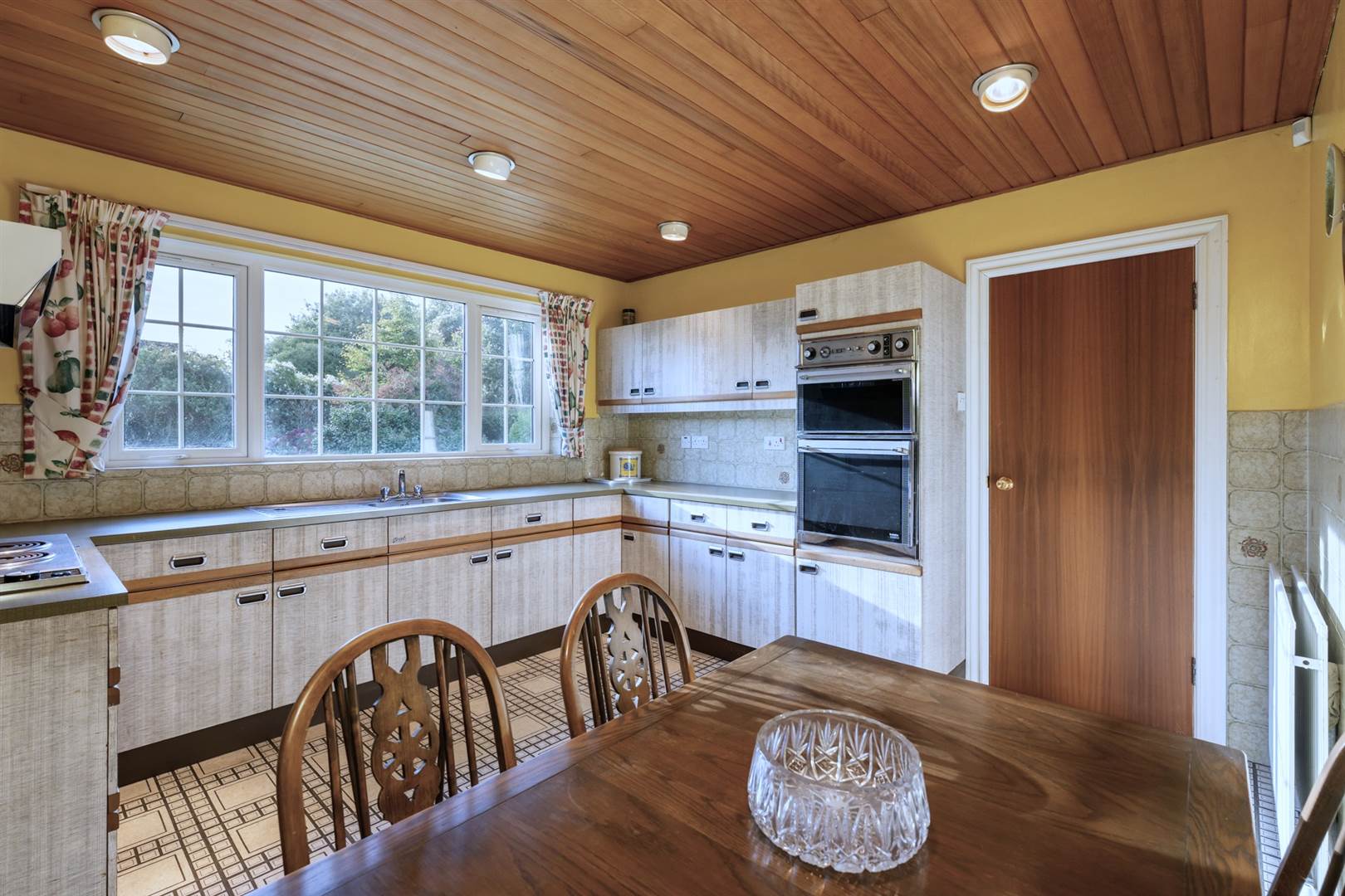 Extensive range of high and low level cupboards, Formica worktops, single drainer stainless steel sink unit with mixer tap, four ring Creda Plan oven and Neff extractor over, Creda Plan double oven, part tiled walls, tongue and groove ceiling. Access to garage.
