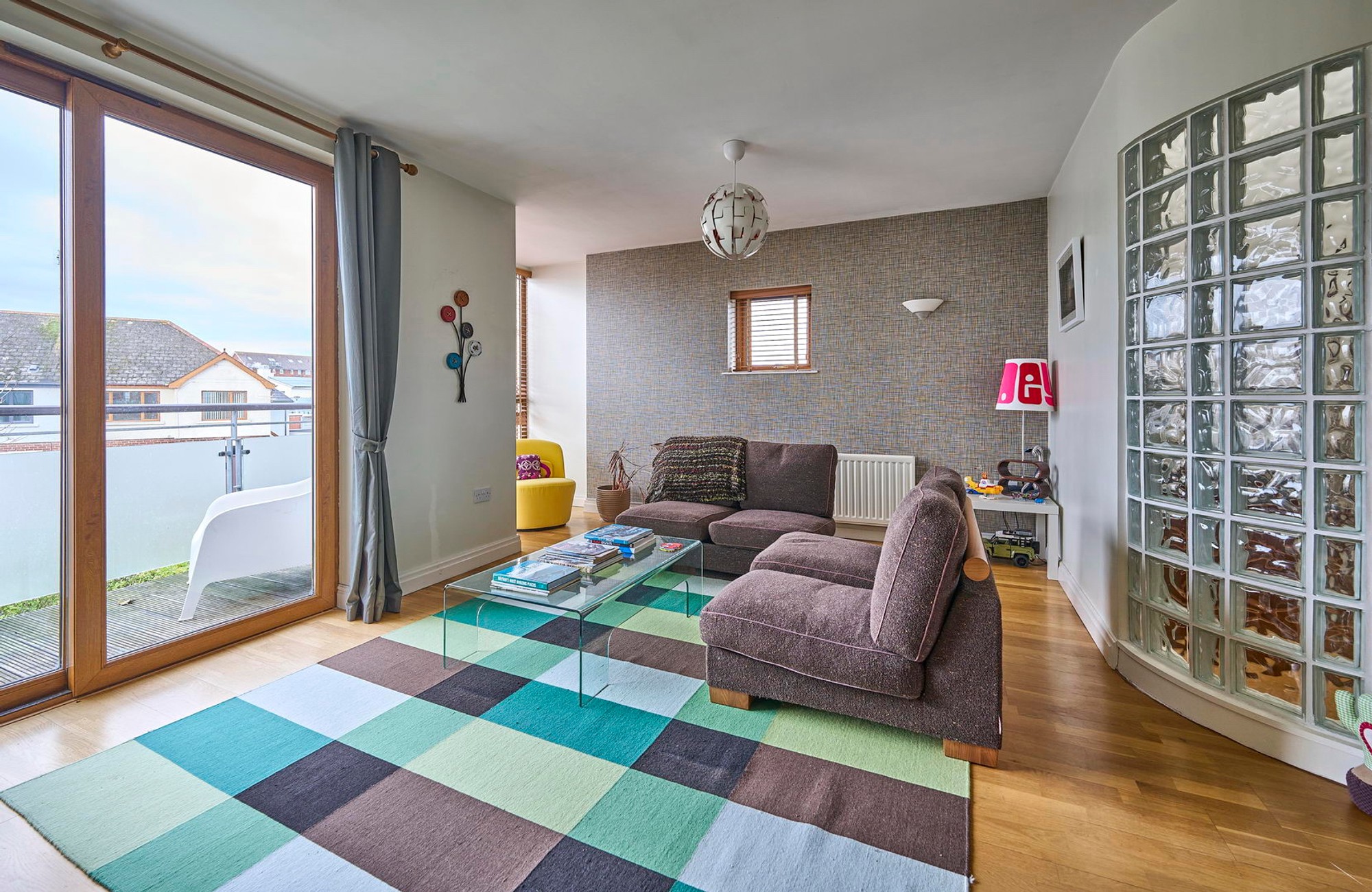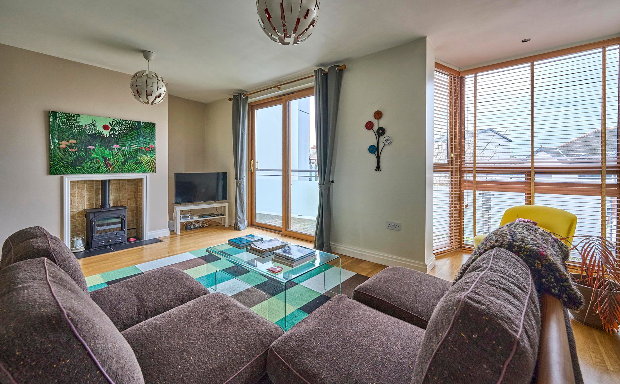 Narrowing to 9'00". Hole in wall style fire place with slate hearth, wired for wall lights, sliding doors to balcony. Open plan to kitchen.