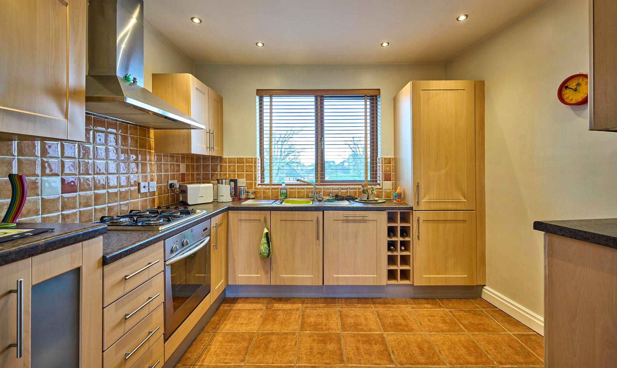 Single drainer stainless steel sink unit with mixer tap, range of high and low level units, formica work surfaces, built in under oven and 4 ring has hob unit, stainless steel extractor hood, integrated fridge/freezer, integrated dish washer, wall tiling, tiled floor, down lighting.