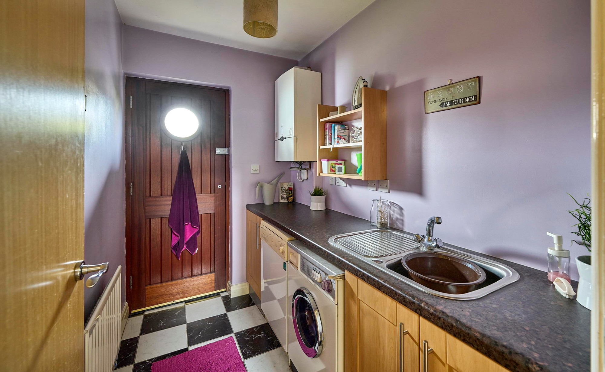 Single drainer stainless steel sink unit with mixer tap, tiled floor, gas fired boiler, washing machine