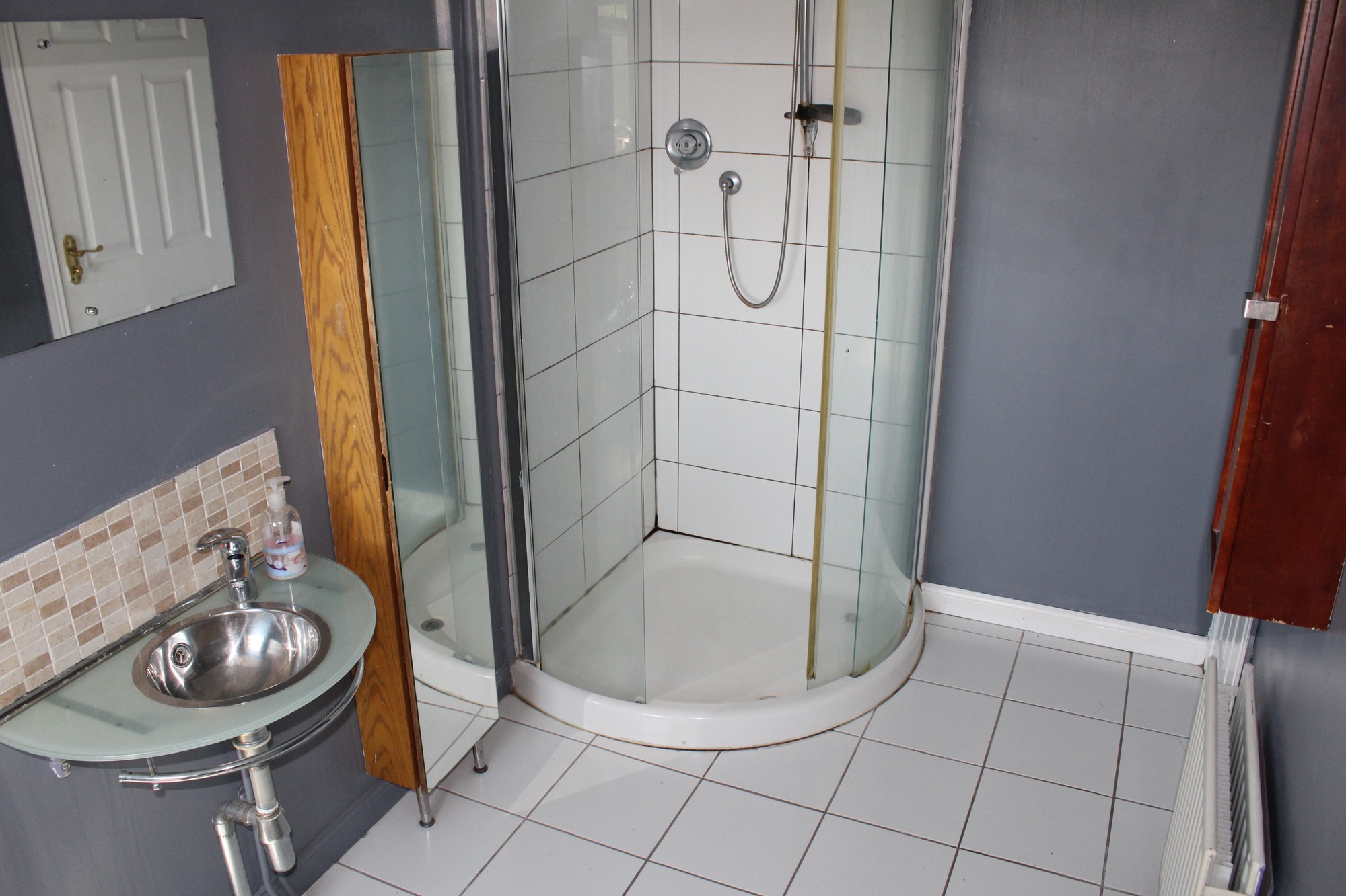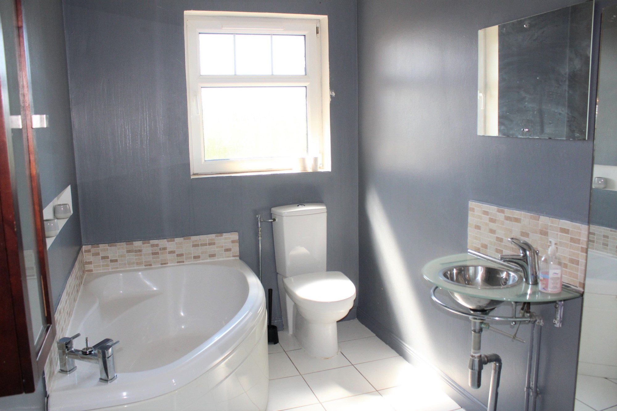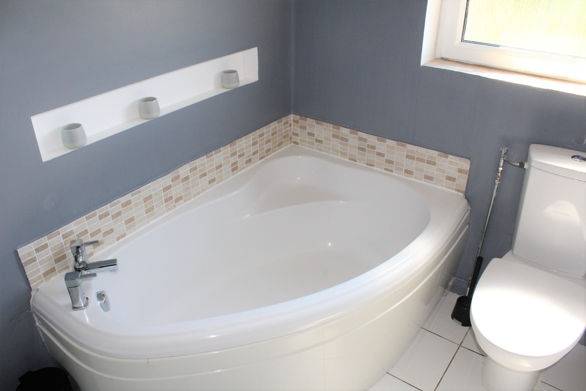 Corner bath with mixer tap, wash hand basin, low flush wc, tiled shower cubicle with main shower, tiled floor.