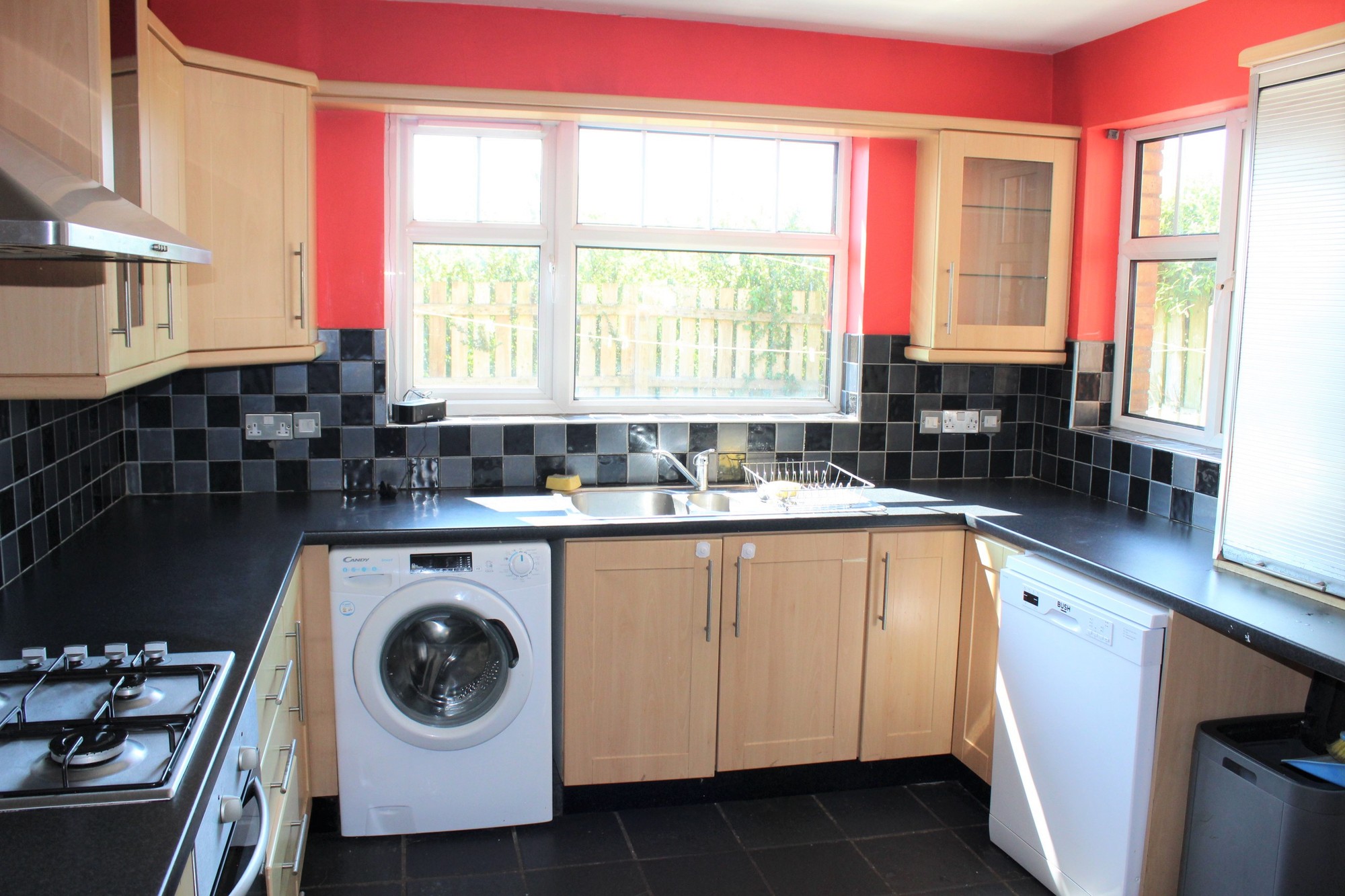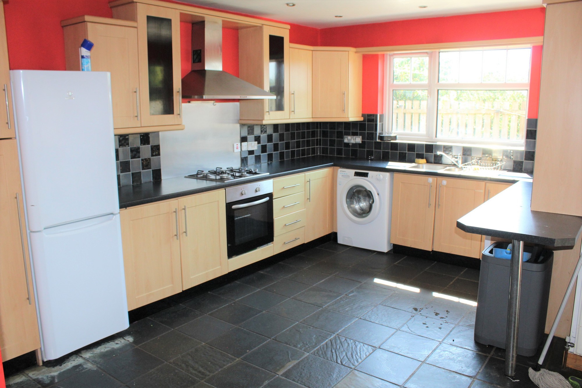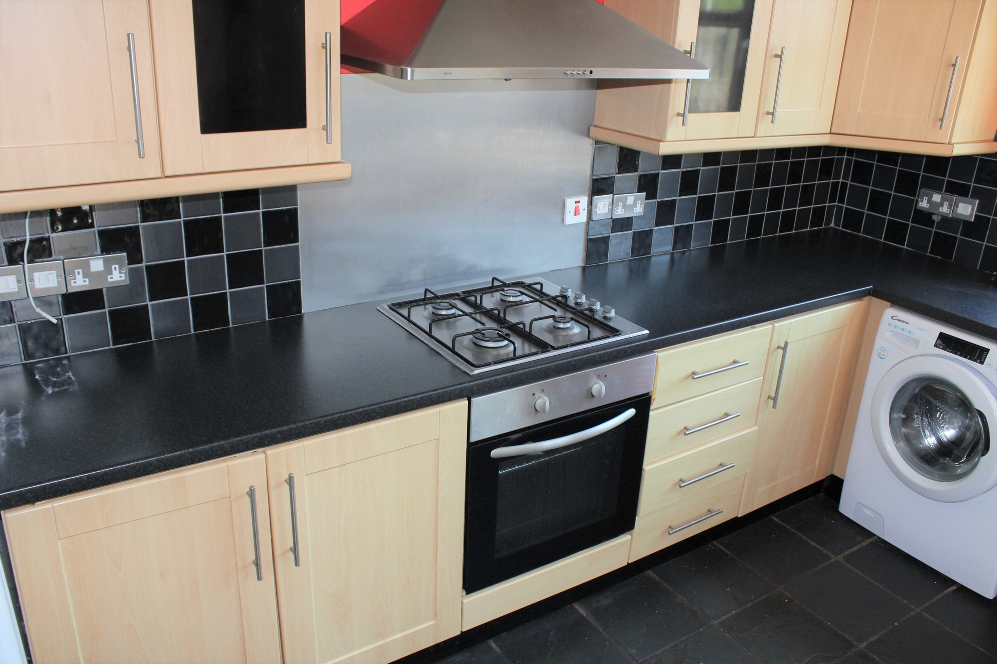 One and a half bowl single drainer stainless steel sink unit with mixer tap, range of high and low level units, formica work surfaces, built in under oven and gas hob, stainless steel extractor hood, plumbed for washing machine and dish washer, slate flooring.