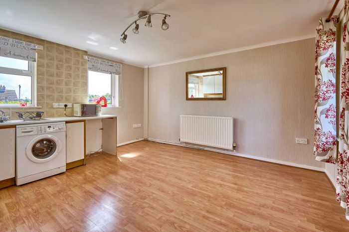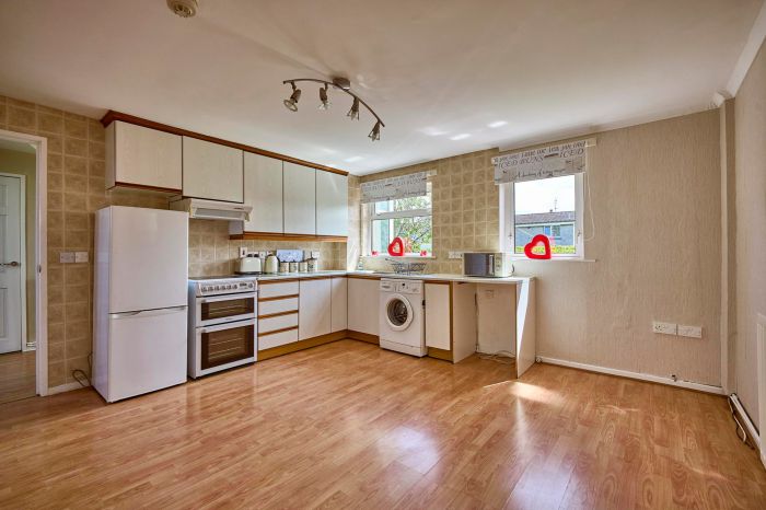 Single drainer stainless steel sink unit with mixer tap, range of high and low level units, formica work surfaces, extractor hood, plumbed for washing machine, wall tiling, laminate wood flooring.