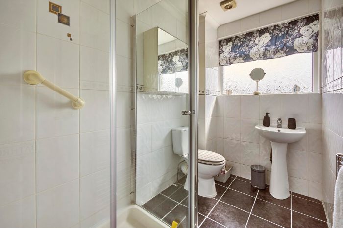 White suite comprising pedestal wash hand basin, low flush wc, double shower cubicle, wall tiling, tiled floor, extractor fan.