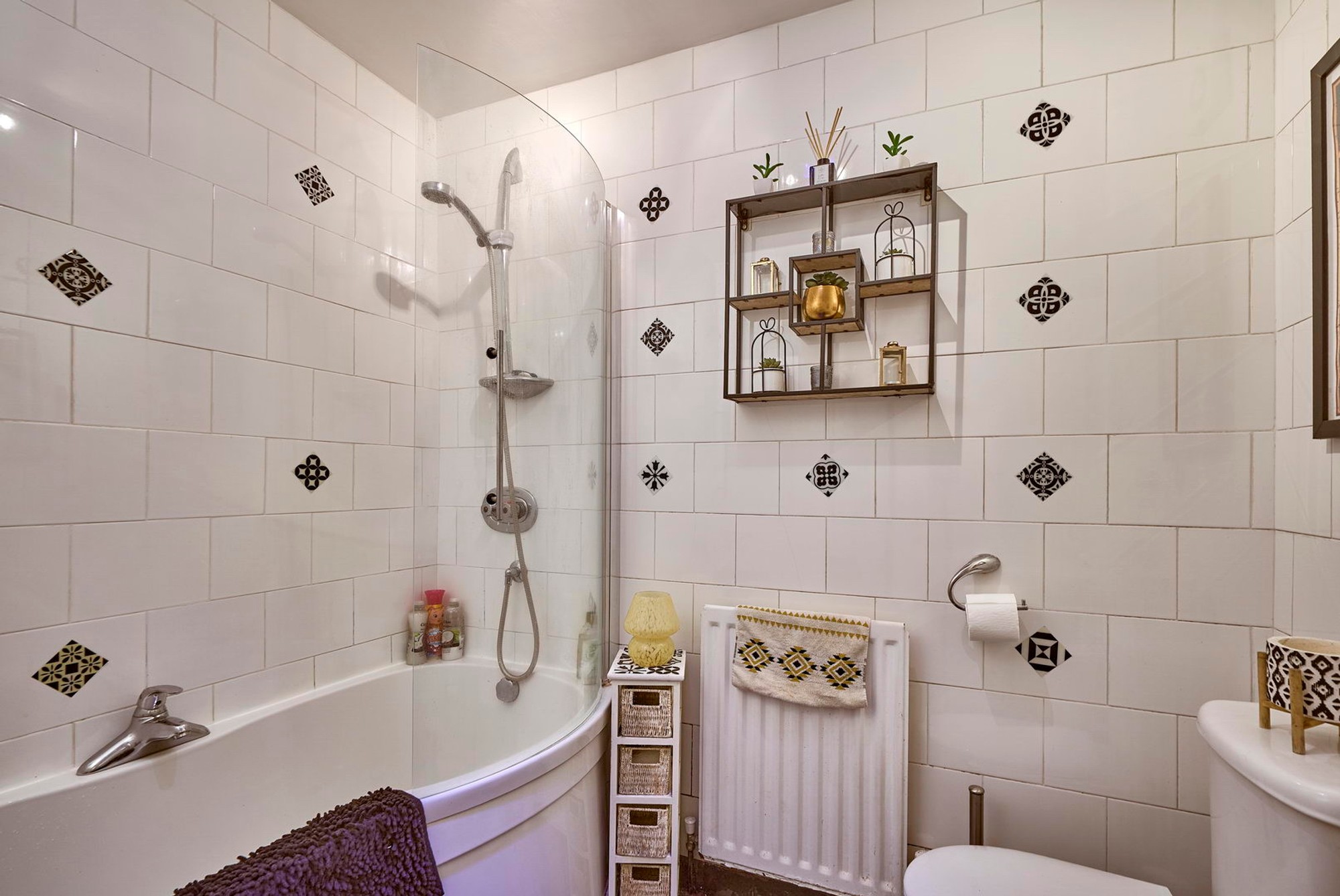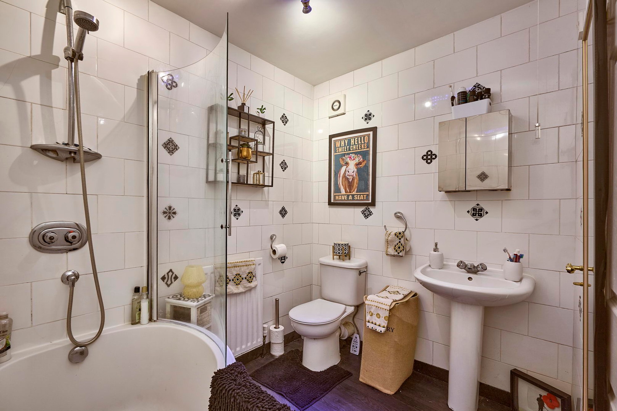 White suite comprising panelled bath with thermostatically controlled shower and shower screen door, pedestal wash hand basin with mixer tap, low flush wc, fully tiled walls, extractor fan.