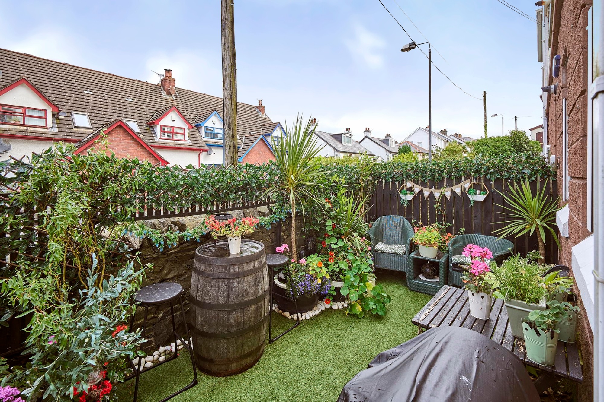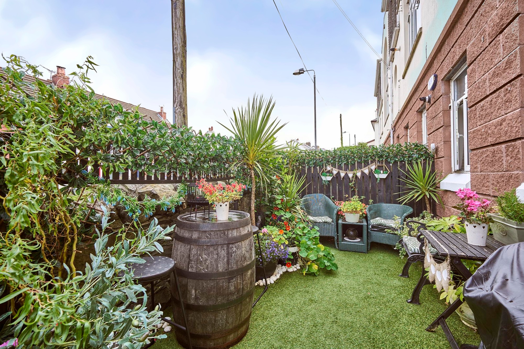 Enclosed rear garden in artificial grass where you can enjoy the late afternoon and evening sun.