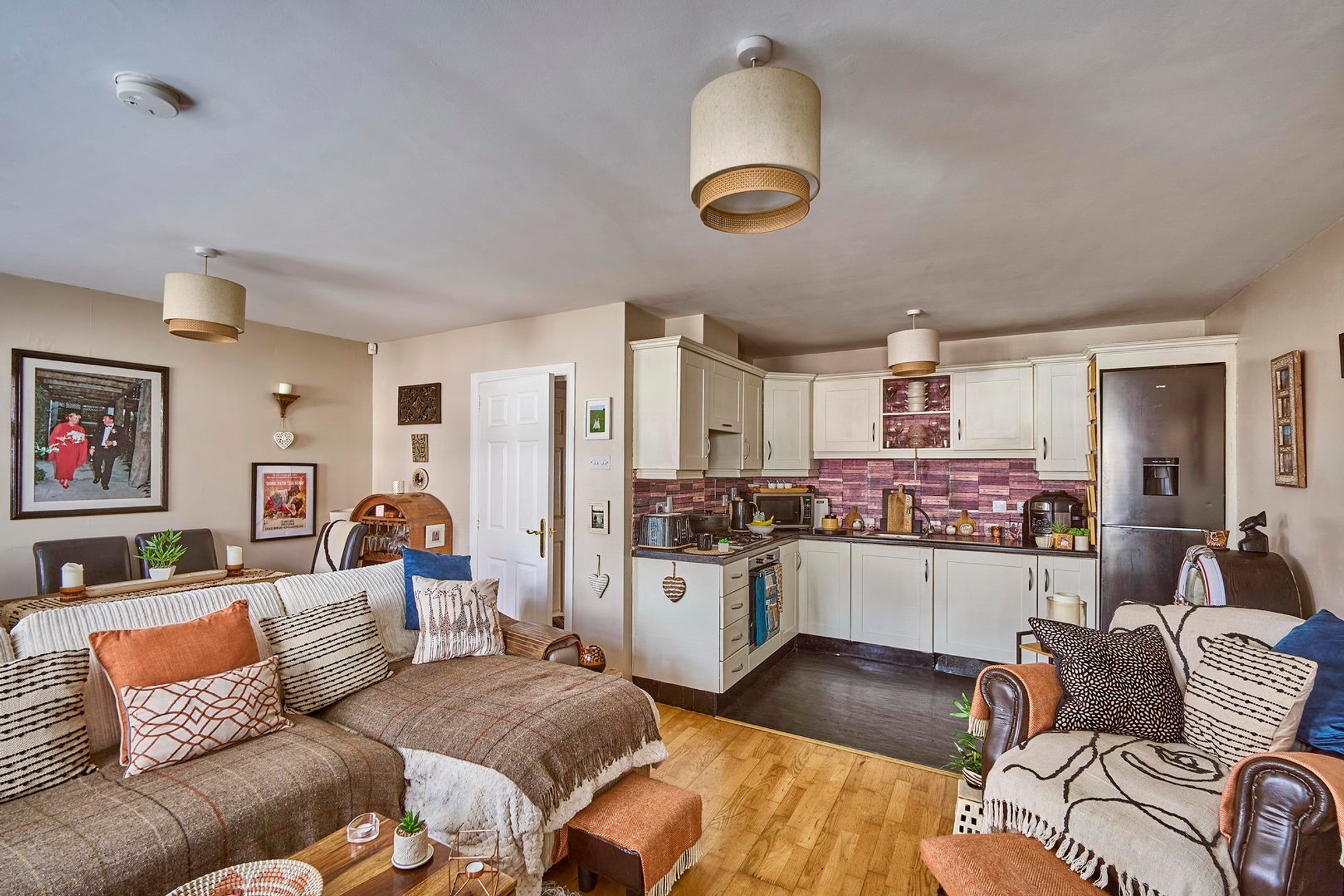 Solid wood flooring, open plan to kitchen/dining, door to garden.