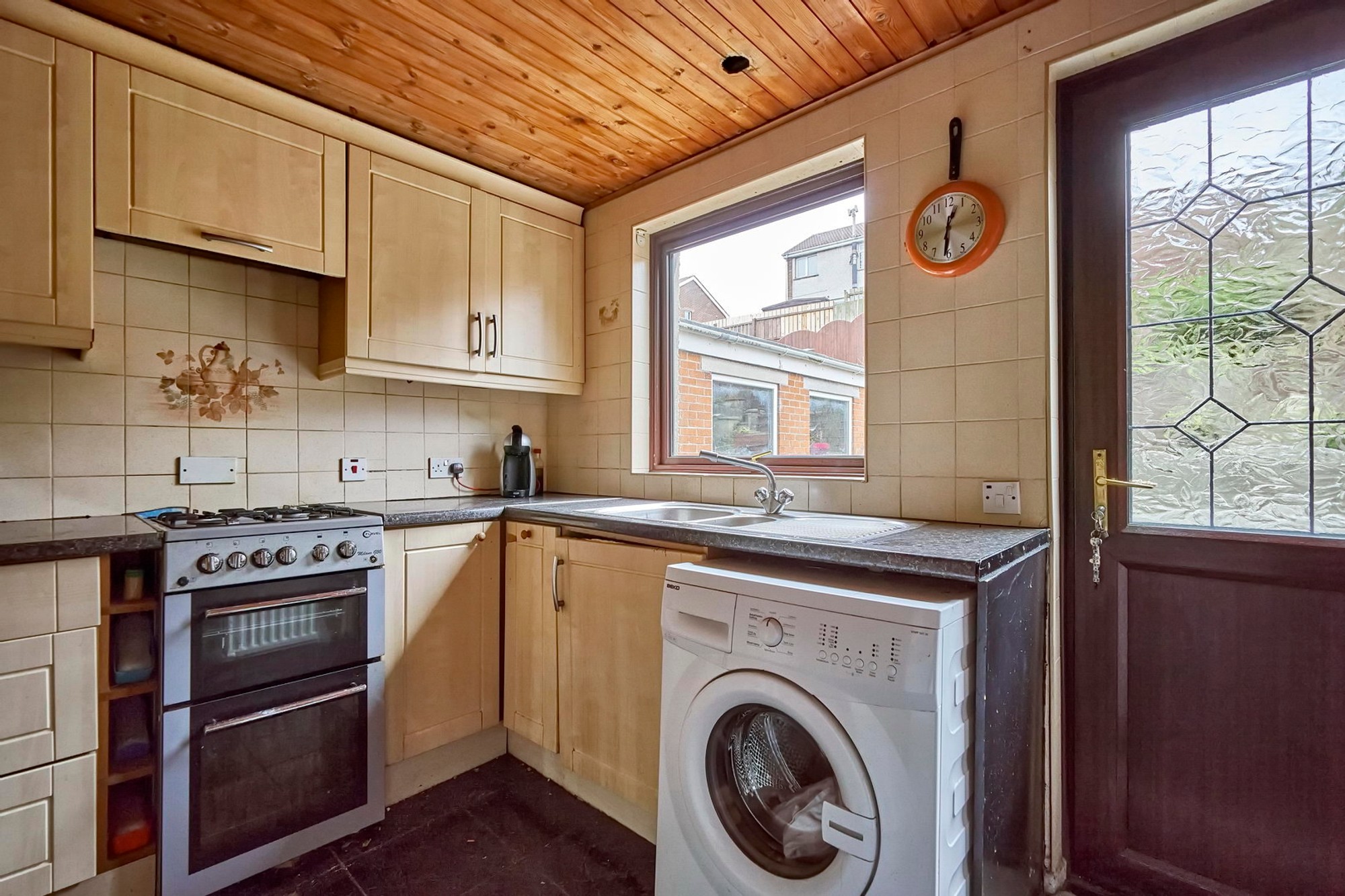 Single drainer stainless steel sink unit with mixer tap, range of high and low level units formica work surfaces, plumbed for washing machine, wall tiling, tongue and groove panelled ceiling.