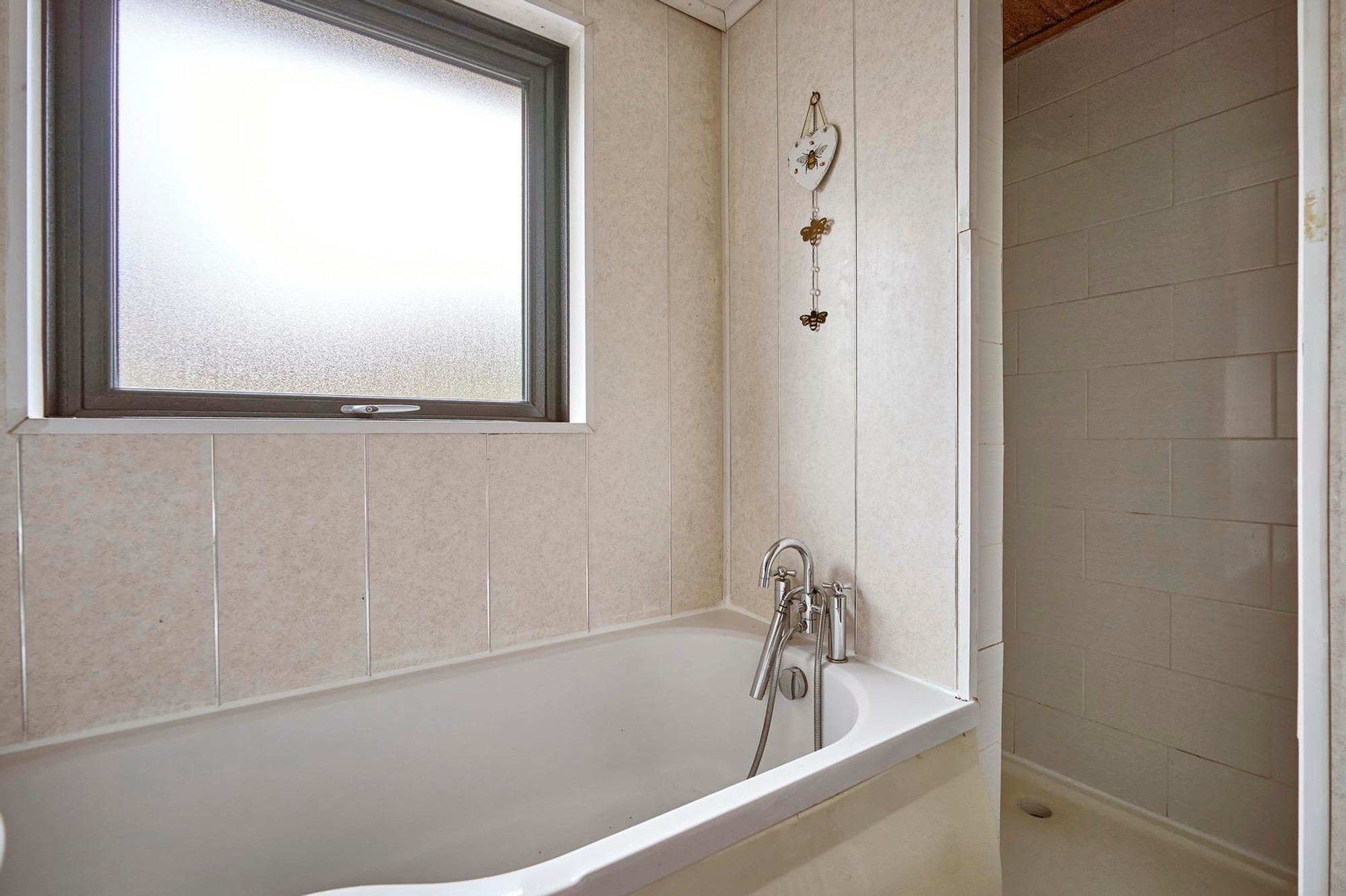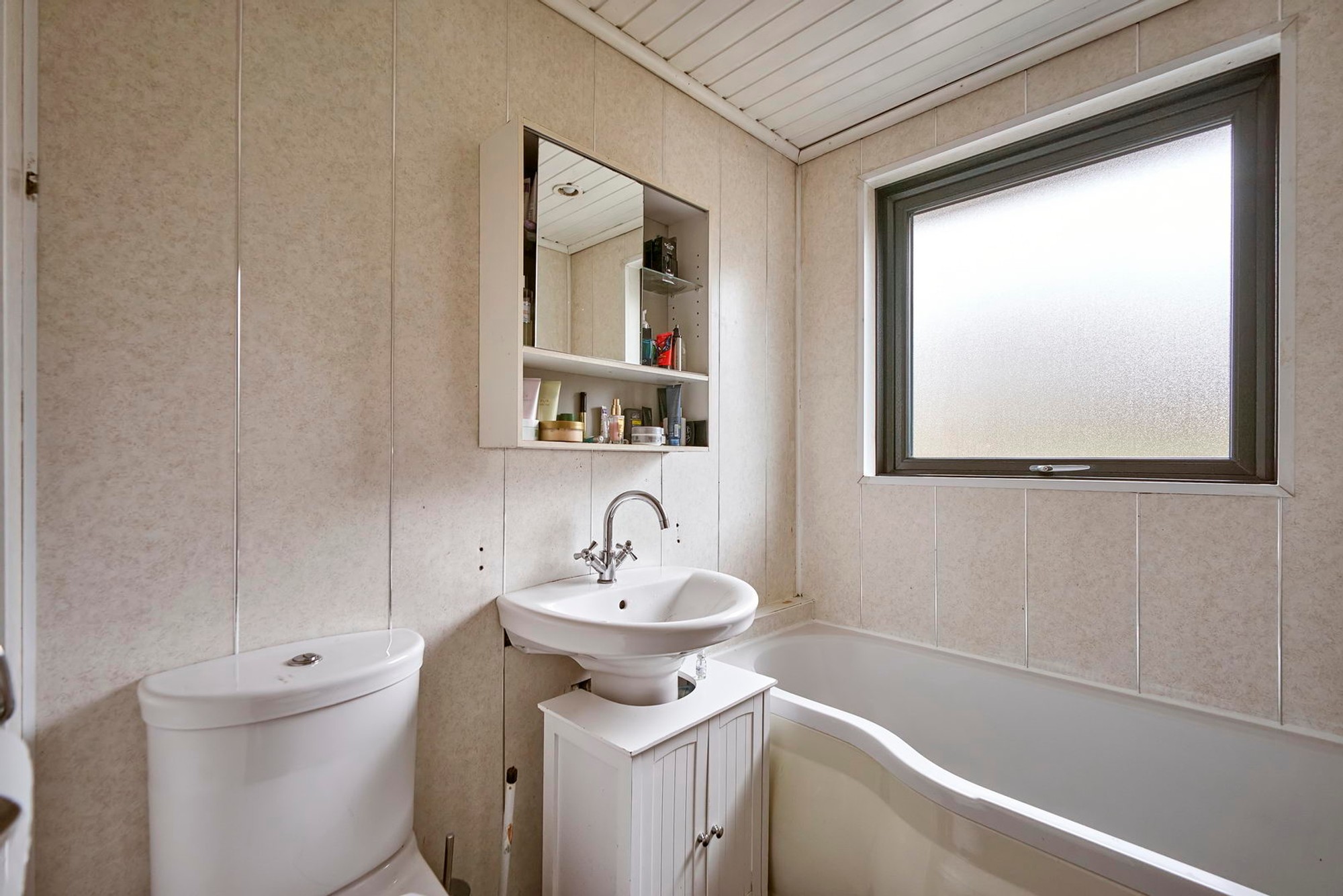 White suite comprising panelled bath with mixer tap and handset, pedestal wash hand basin, low flush wc, walk in shower with mains shower, panelled walls and ceiling.