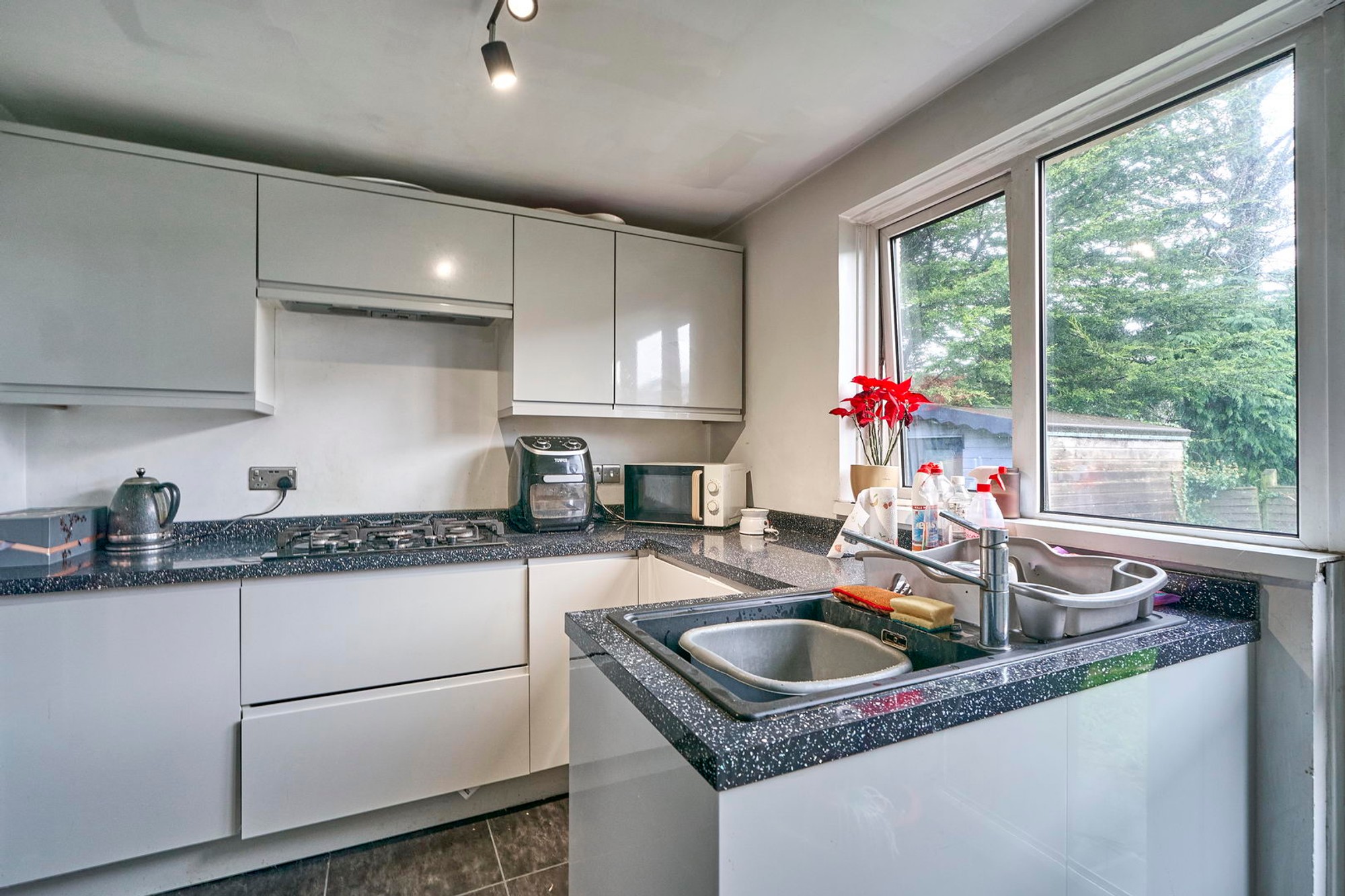 Fitted kitchen with a range of hi and low level white gloss units, built in gas hob/oven and fridge freezer.