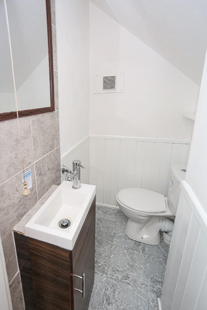 Low flush WC, vanity wash hand basin mixer tap, extractor fan.