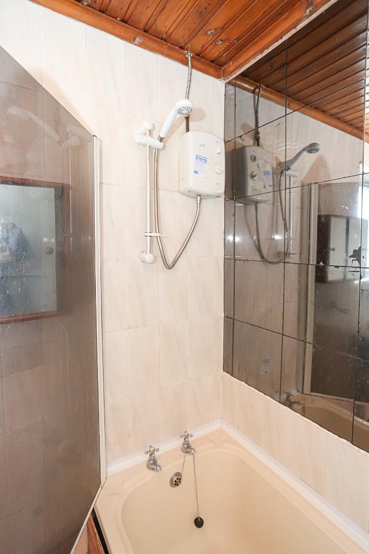Paneled bath, electric shower, pedestal wash hand basin, low flush wc, pine paneled ceiling.
