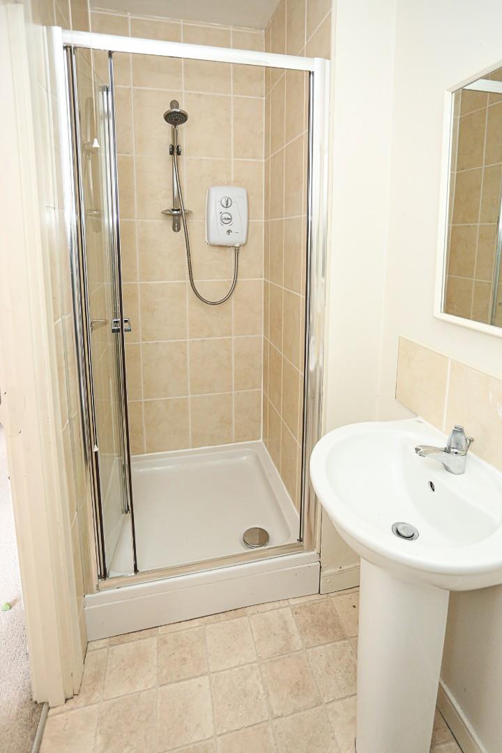 Shower cubicle with electric shower over, pedestal wash hand basin, low flush WC, extractor fan, tiled floor.