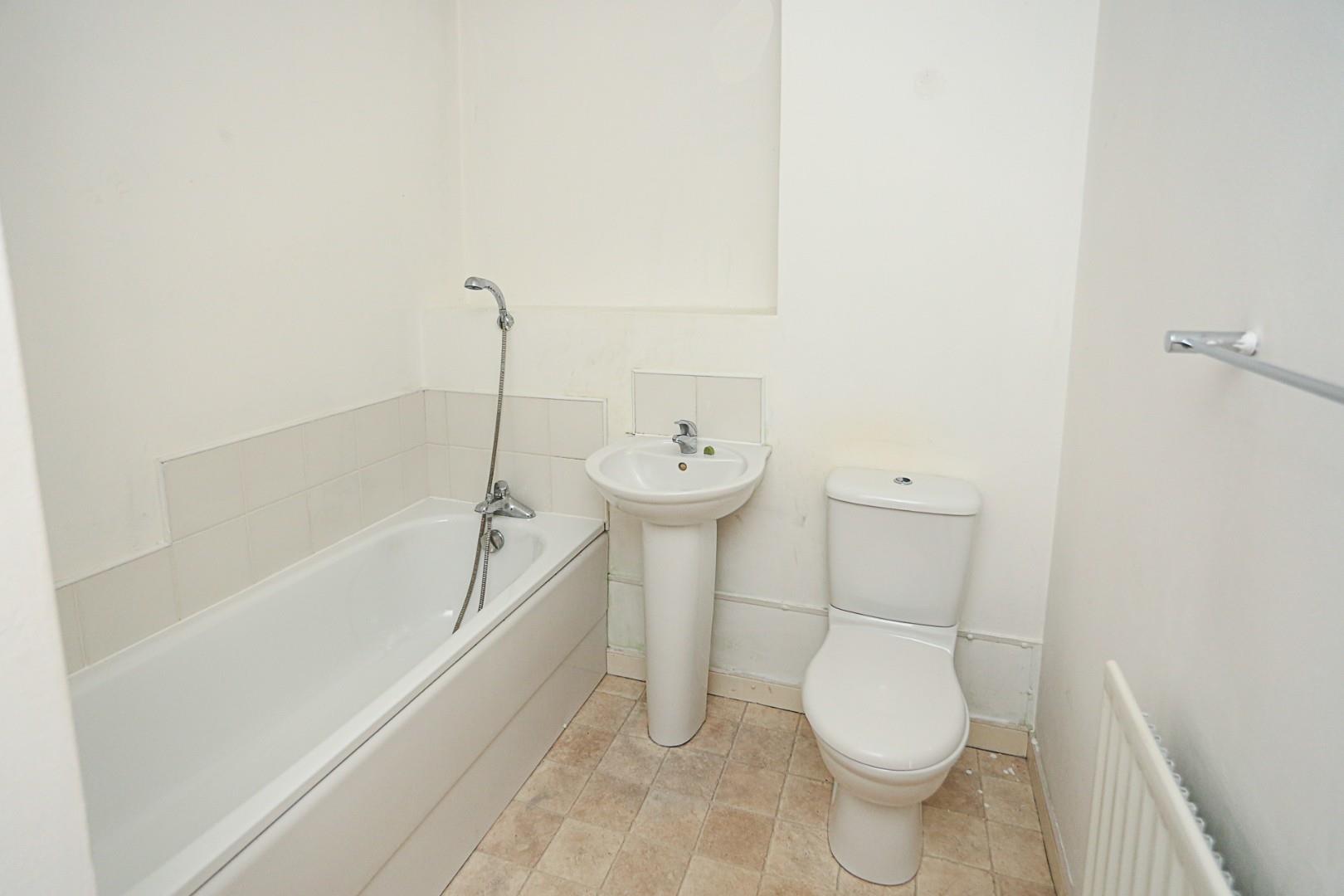 Paneled bath with mixer tap and shower attachment, low flush WC, pedestal wash hand basin, splash back tiling, tiled floor, extractor fan.