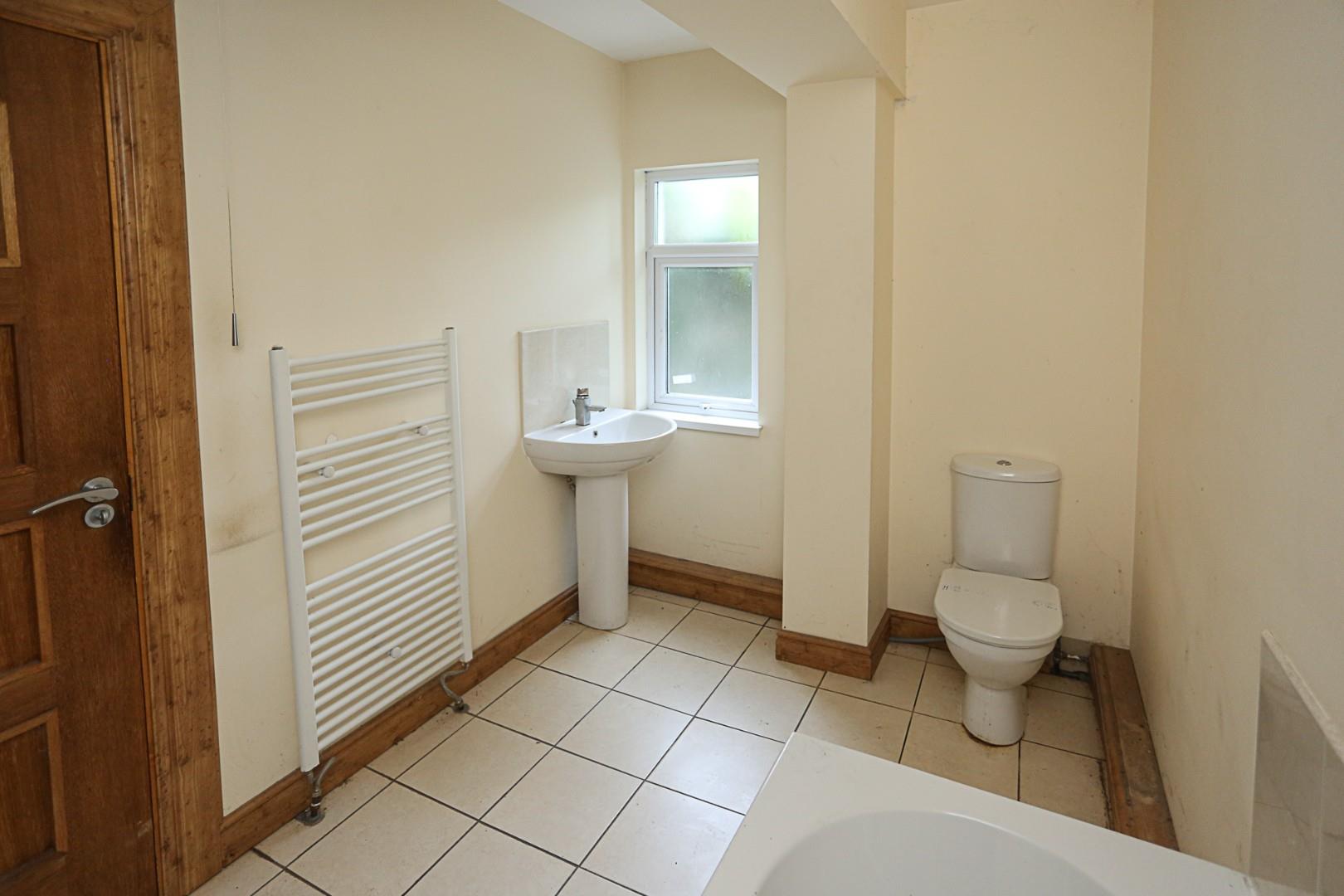 Paneled bath with mixer tap and shower attachment, low flush WC, pedestal wash hand basin with mixer tap, fully tiled walls, tiled floor.