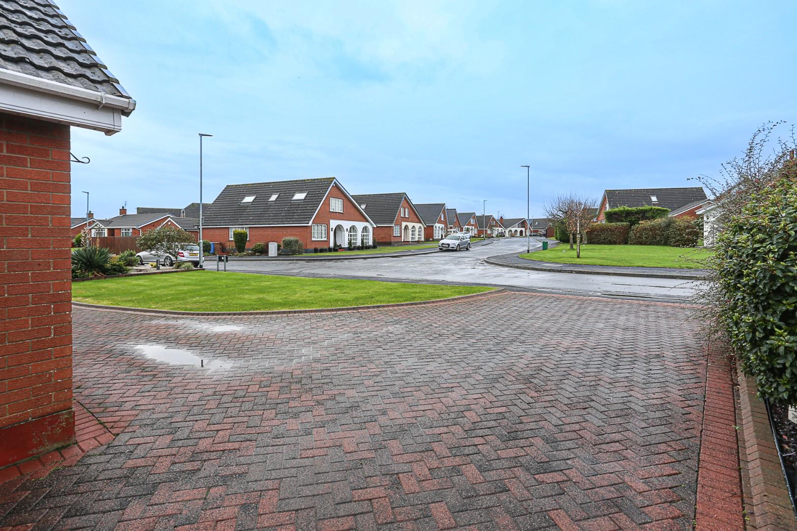 Red brick paved driveway with parking for multiple cars, garden to front in lawn and enclosed garden to rear bounded by fencing laid in lawn with paved patio area.