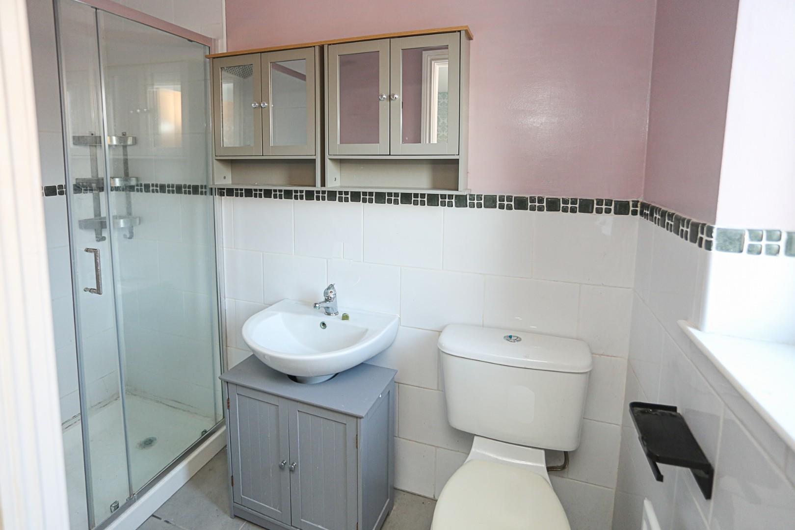 Shower cubicle with rain shower, pedestal wash hand basin, low flush WC, tiled floor, part tiled walls.