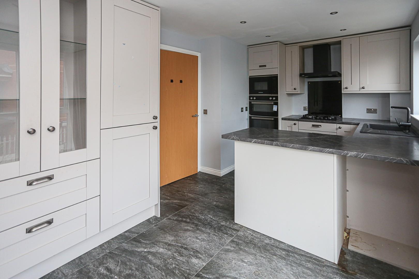 High and low level units integrated dishwasher and fridge freezer, four ring gas hob, electric oven, single drainer sink unit with mixer tap, glazed display cabinet, breakfast bar.