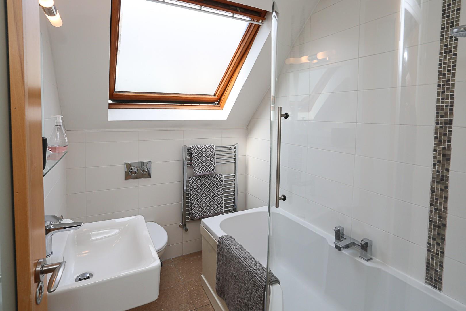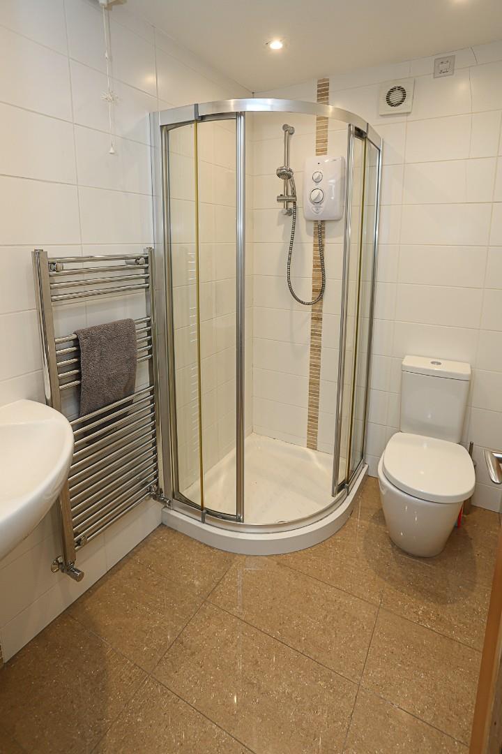 Modern suite comprising of shower cubicle with electric shower unit, low flush WC, wash hand basin, fully tiled walls, tiled floor, heated towel rail, extractor.