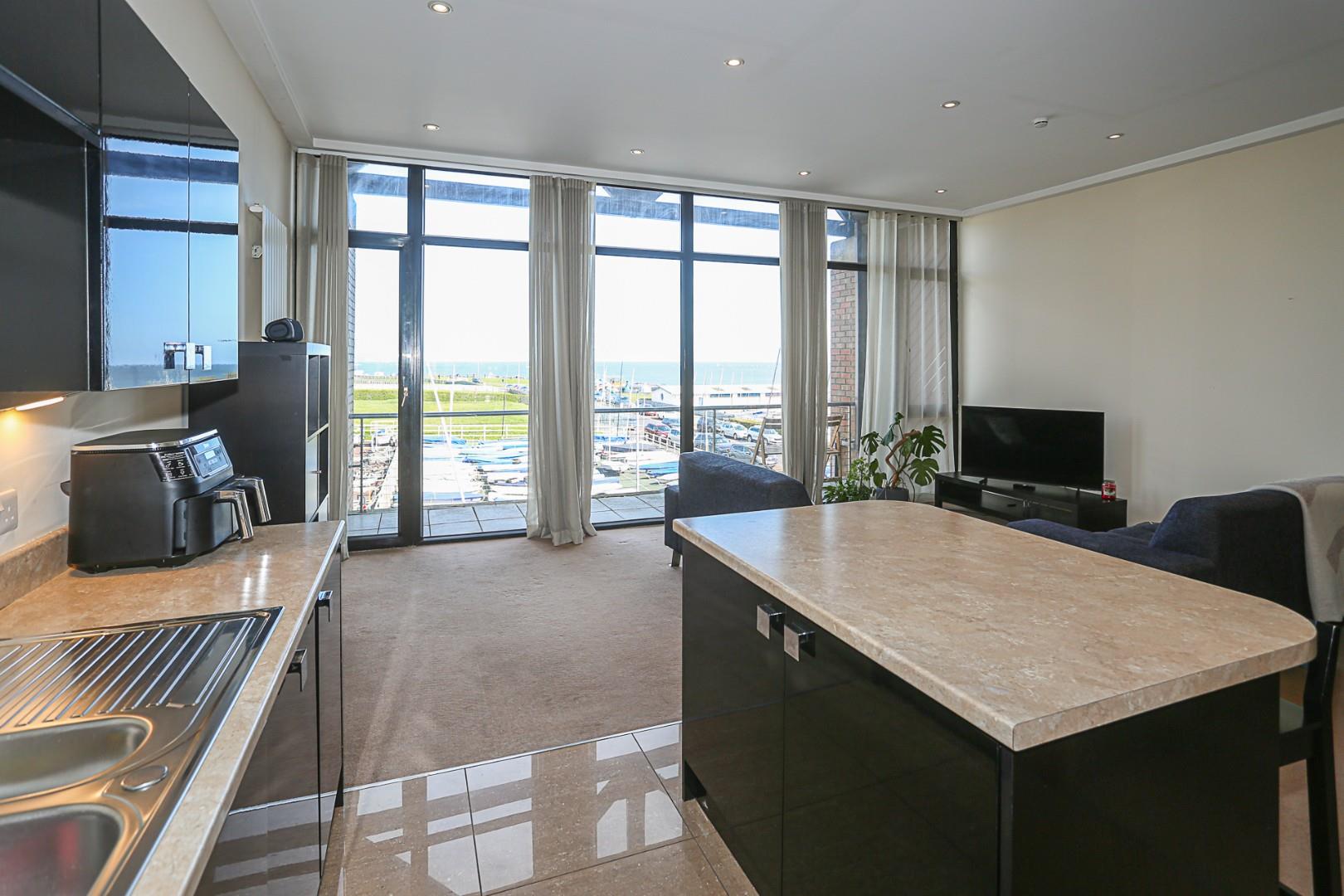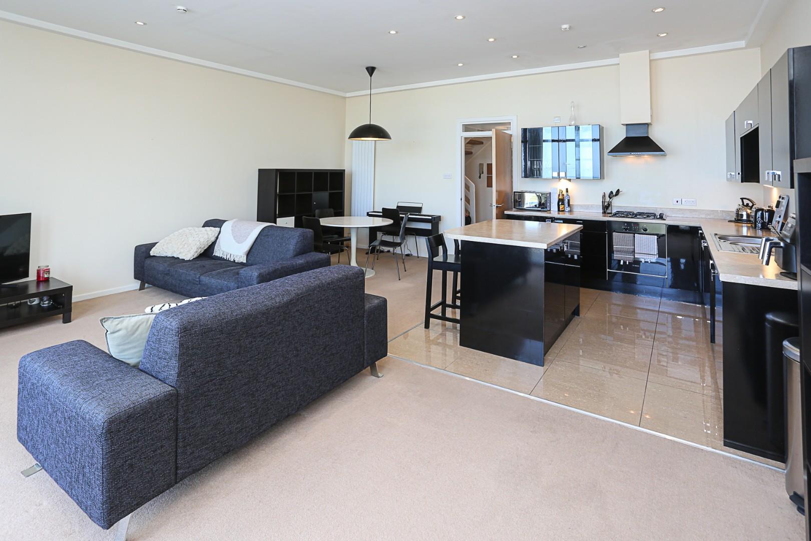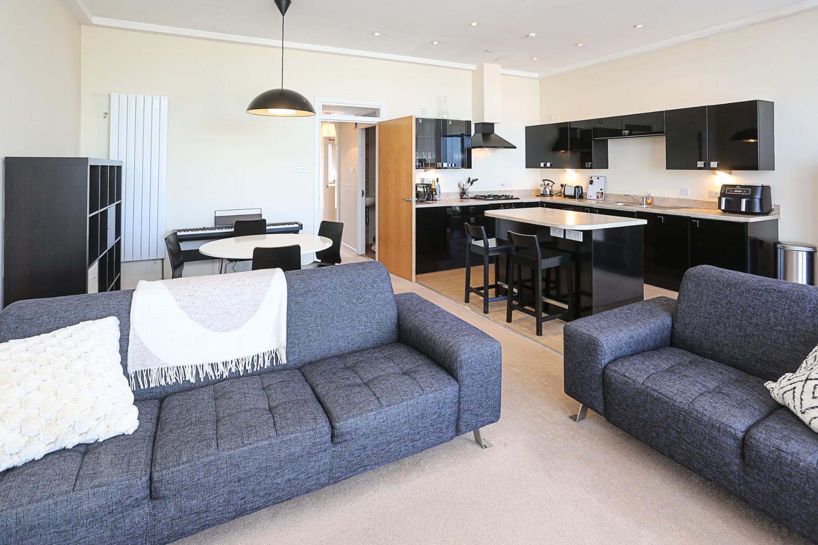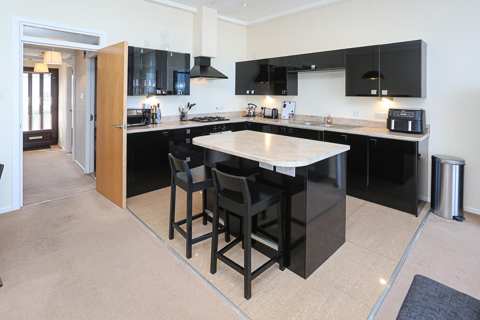Excellent range of black gloss high and low level units, one and a half bowl stainless steel sink unit with mixer tap, integrated dish washer, integrated washing machine, four ring gas hob and electric under oven, extractor hood, center island and breakfast bar with integrated fridge and freezer. Floor to ceiling windows with stunning sea views and access to a private balcony.