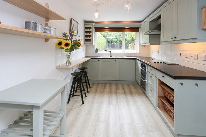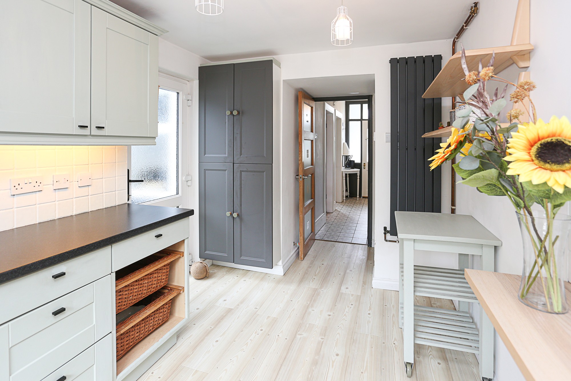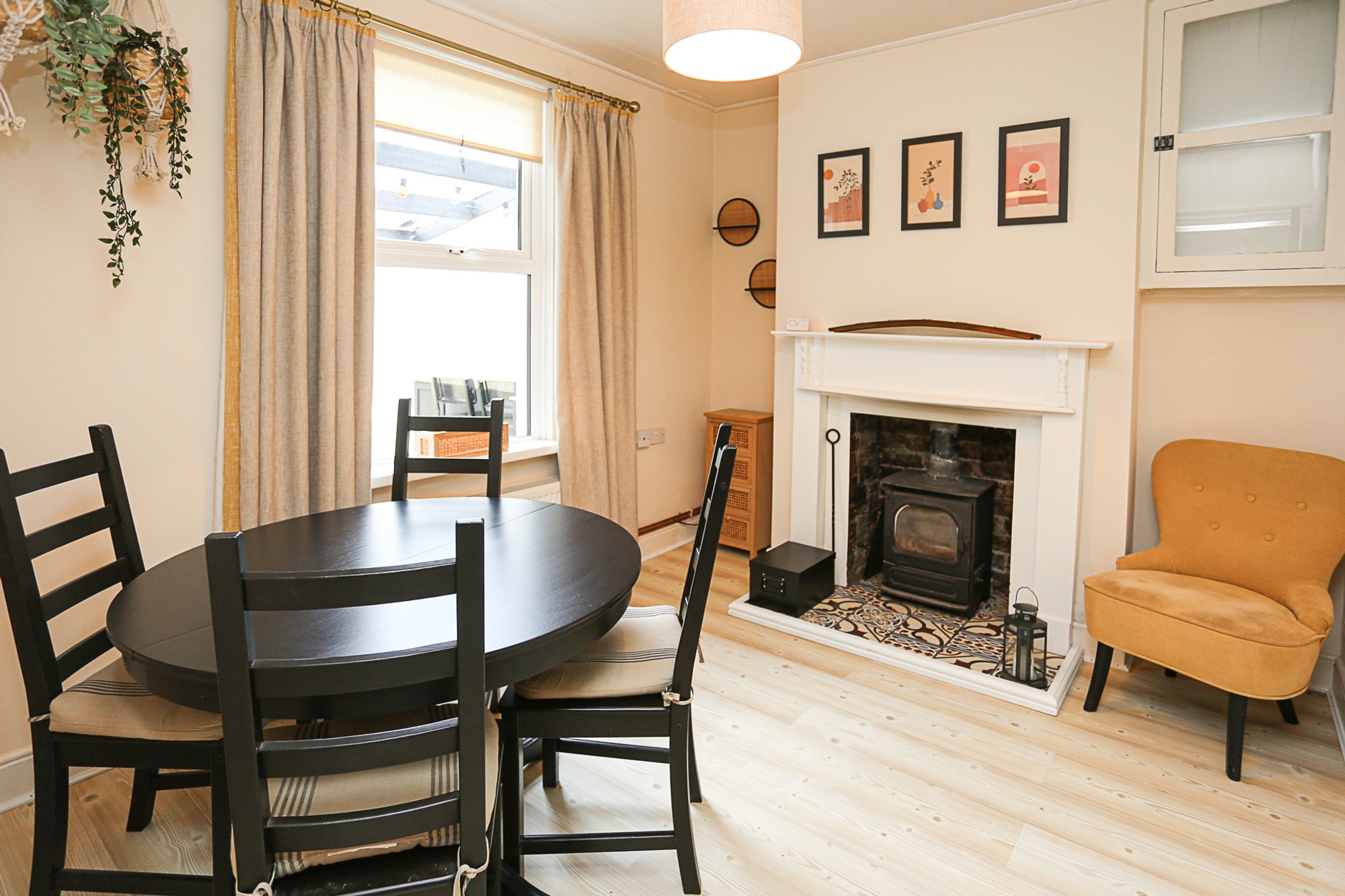 The ground floor comprises a living room and a separate modern living space with a wood burning stove leading to a bright modern kitchen fitted with appliances.
