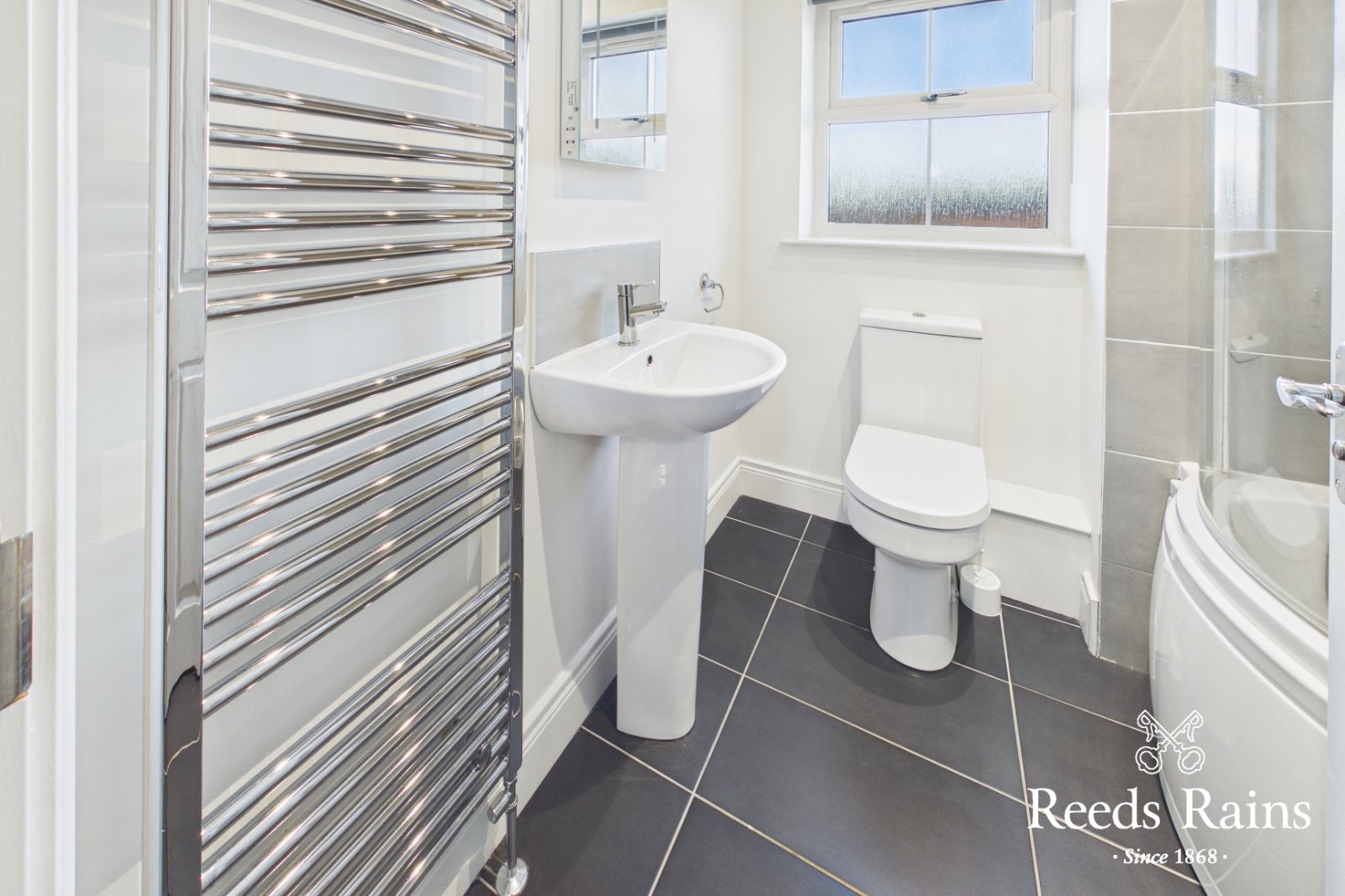 Stylish white sanitary ware with chrome fittings. Shower over bath with screen door. Chrome heated towel rail.