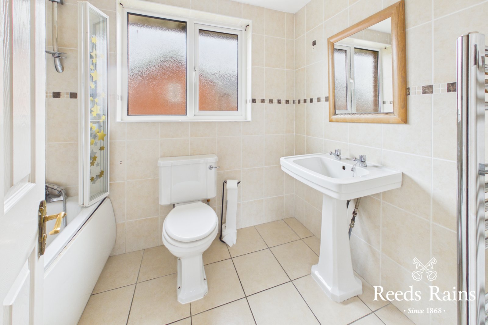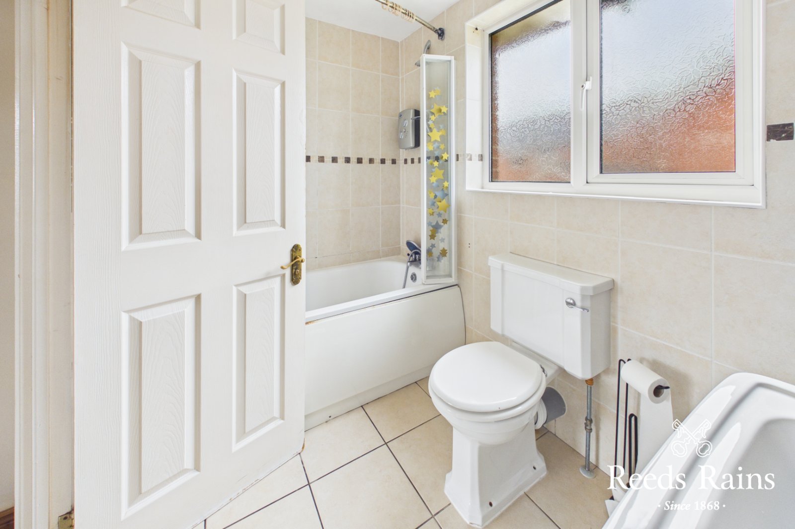 White suite, panel bath with mixer taps, Creda electric shower unit, low flush WC, pedestal wash hand basin, ceramic tiled floor, fully tiled walls, heated towel rail, recessed spotlights.
