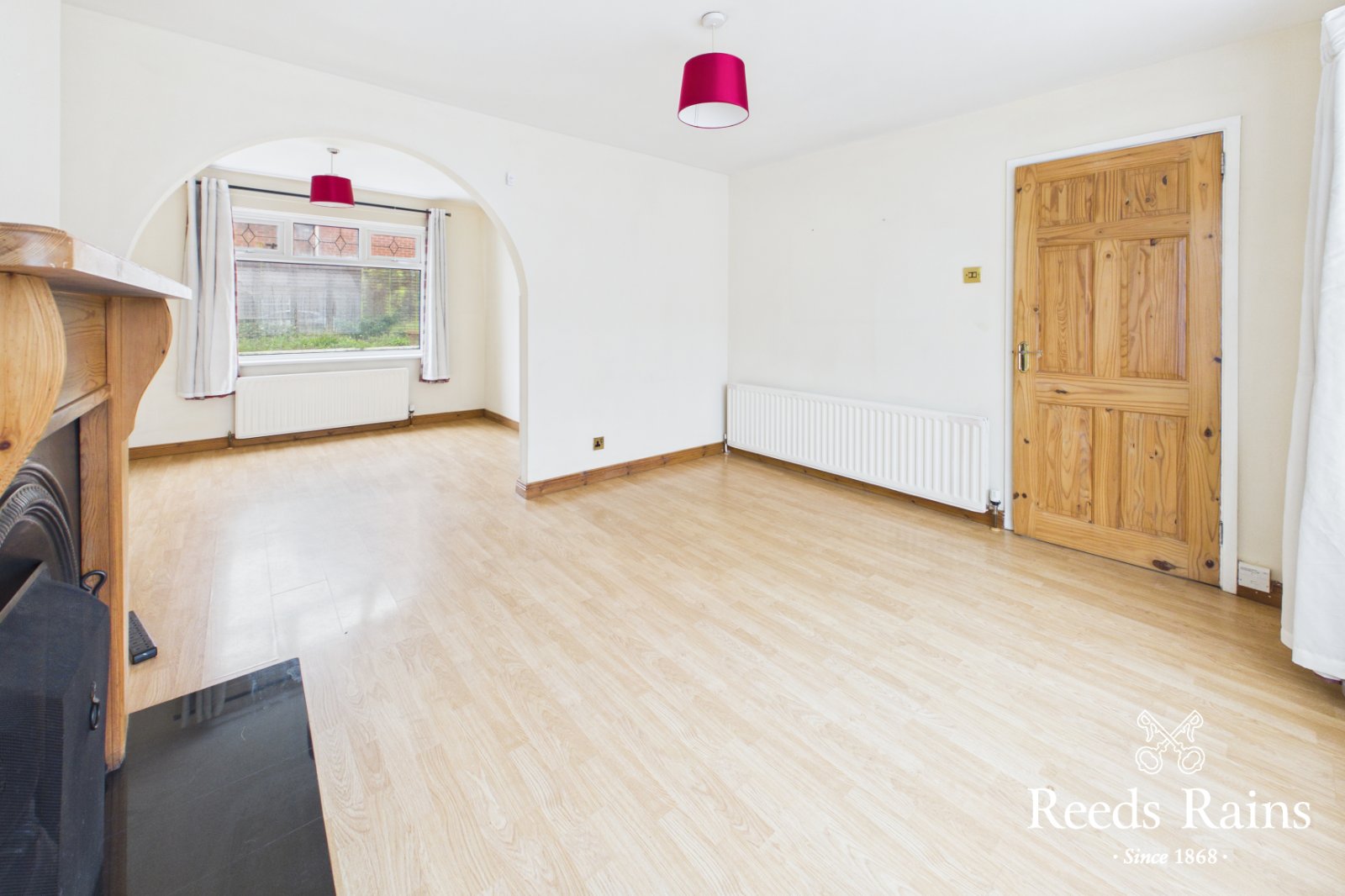 Laminate wooden floor, feature fireplace with wood surround, tiled hearth, open to: