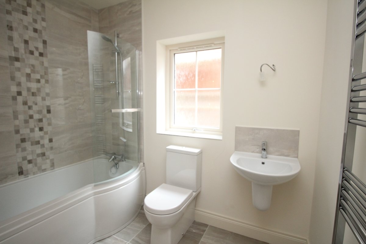 Modern white suite. Panel bath with overhead shower. Close coupled wc. Wash hand basin. Ceramic tiled floor. Part tiled walls. Low voltage spotlights.