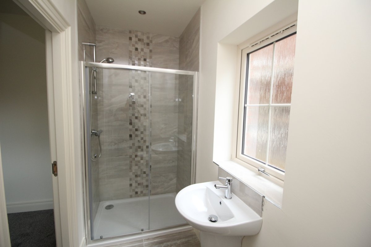 Built in shower cubicle with thermostatically controlled shower. Close coupled wc. Wash hand basin with mono tap. Heated towel rail. Ceramic tiled floor. Extractor fan. Low voltage spotlights.