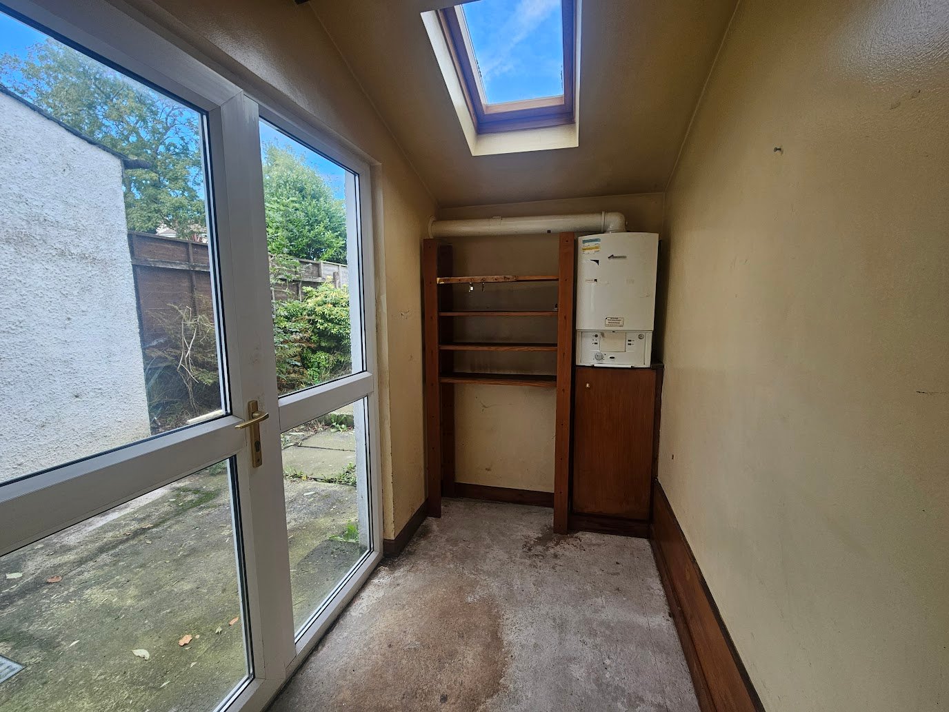 The ground floor accommodation comprises a lounge, fitted kitchen, and a useful rear porch. On the first floor there are two well-proportioned bedrooms and a bathroom. The property benefits from gas-fired central heating and double-glazed windows, ensuring an efficient base from which to begin refurbishment.